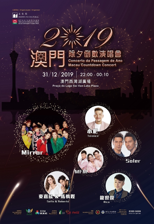 “2019澳门除夕倒数演唱会”将于12月31日晚上10时至零时10分在西湾湖广场举行,邀请香港人气男团Mirror压轴献唱,还有一众本地歌手及组合包括:小肥、龙世杰、Soler、MFM、马檇铿及麦嘉欣倾力演出,为新一年的开始注入新动力;在踏入2020的一刻,旅游塔对出海面将会绽放烟花,点缀澳门夜空,迎接新一年的莅临。