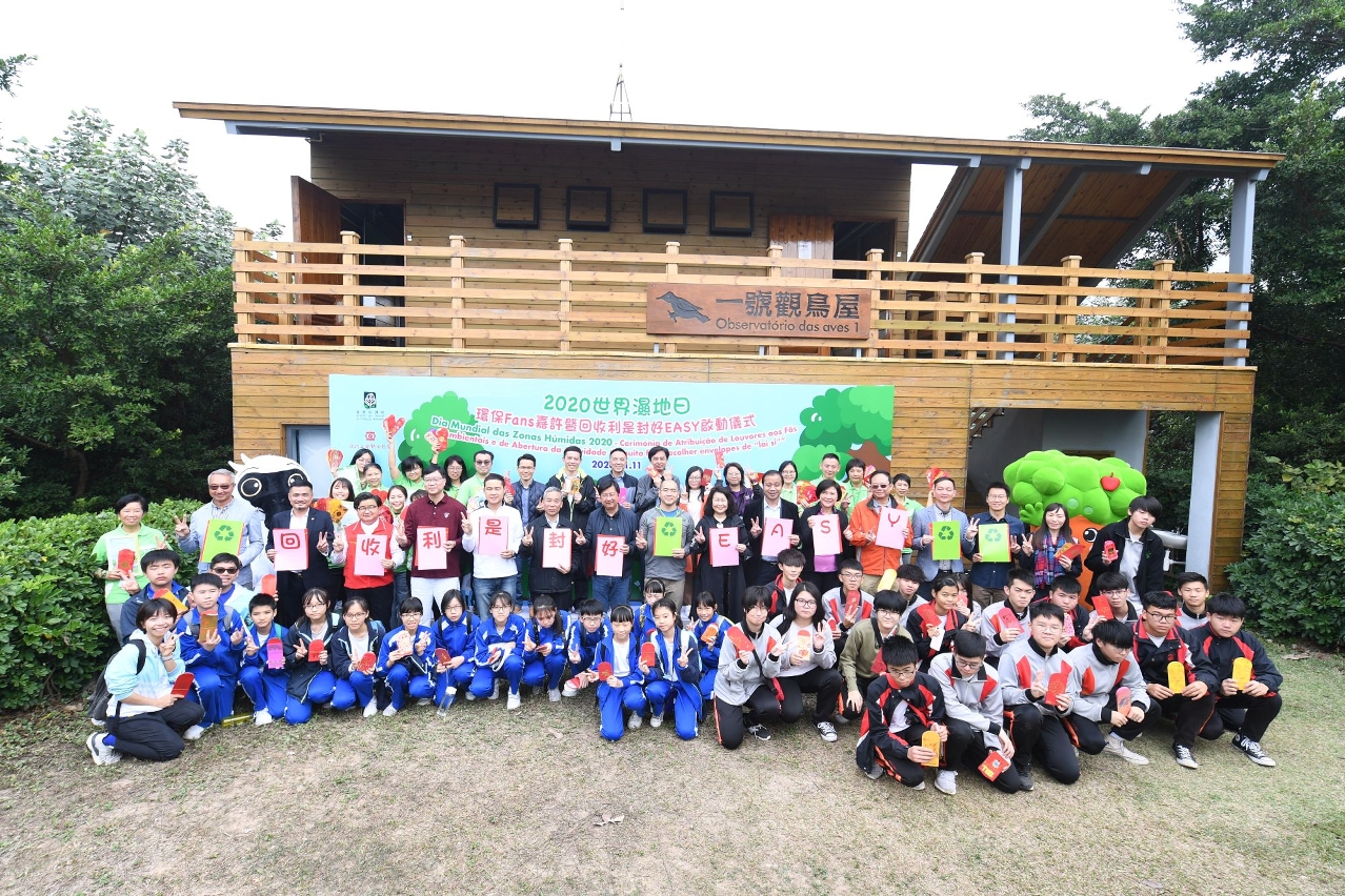 为响应2月2日的世界湿地日,环境保护局于2020年1月11日在路氹城生态保护区举行2020世界湿地日—环保Fans嘉许暨回收利是封好EASY启动仪式。由环境保护局谭伟文局长及“环保Fun”之环保行为攞满Fun活动的协办单位澳门工会联合总会冯家辉副会长,向协助路氹城生态保护区导赏表现出色的环保Fans进行嘉许。