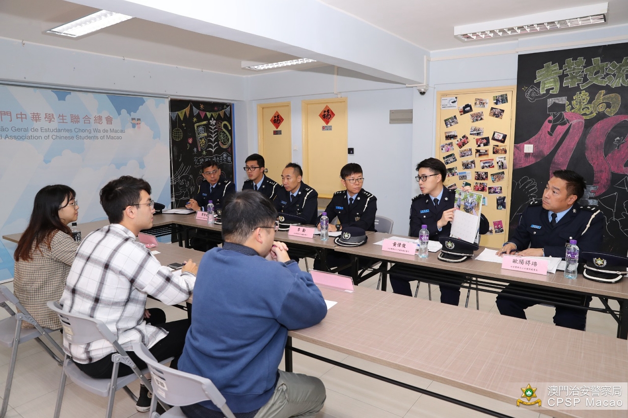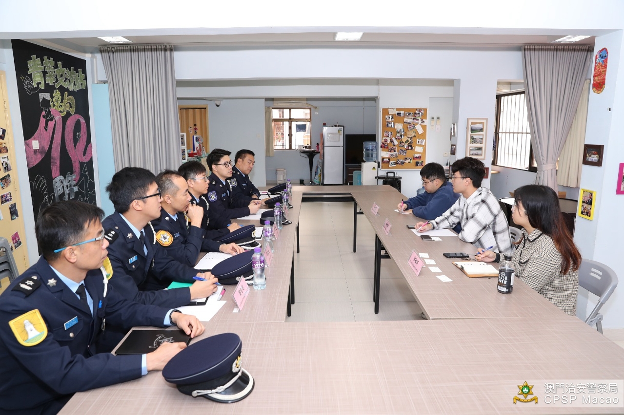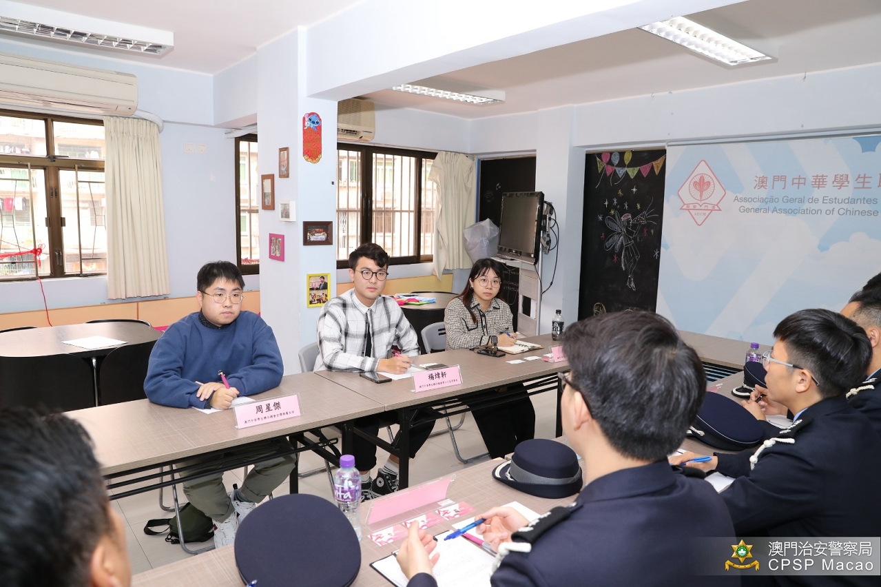 澳门警务厅、交通厅及公共关系处的代表分别介绍了近期罪案和治安情况、交通违例情况、警方在冬防方面的执法和宣传工作、近年开展的青年活动等,又回顾了双方过去在培养青少年身心发展方面的多项合作;学联代表介绍了该会的青年事务整体情况,并表示会将注重交通安全、培养良好的驾驶习惯等讯息传递给会员,以及提醒他们在假期参加庆祝活动时应保管好随身财物和远离毒品。
