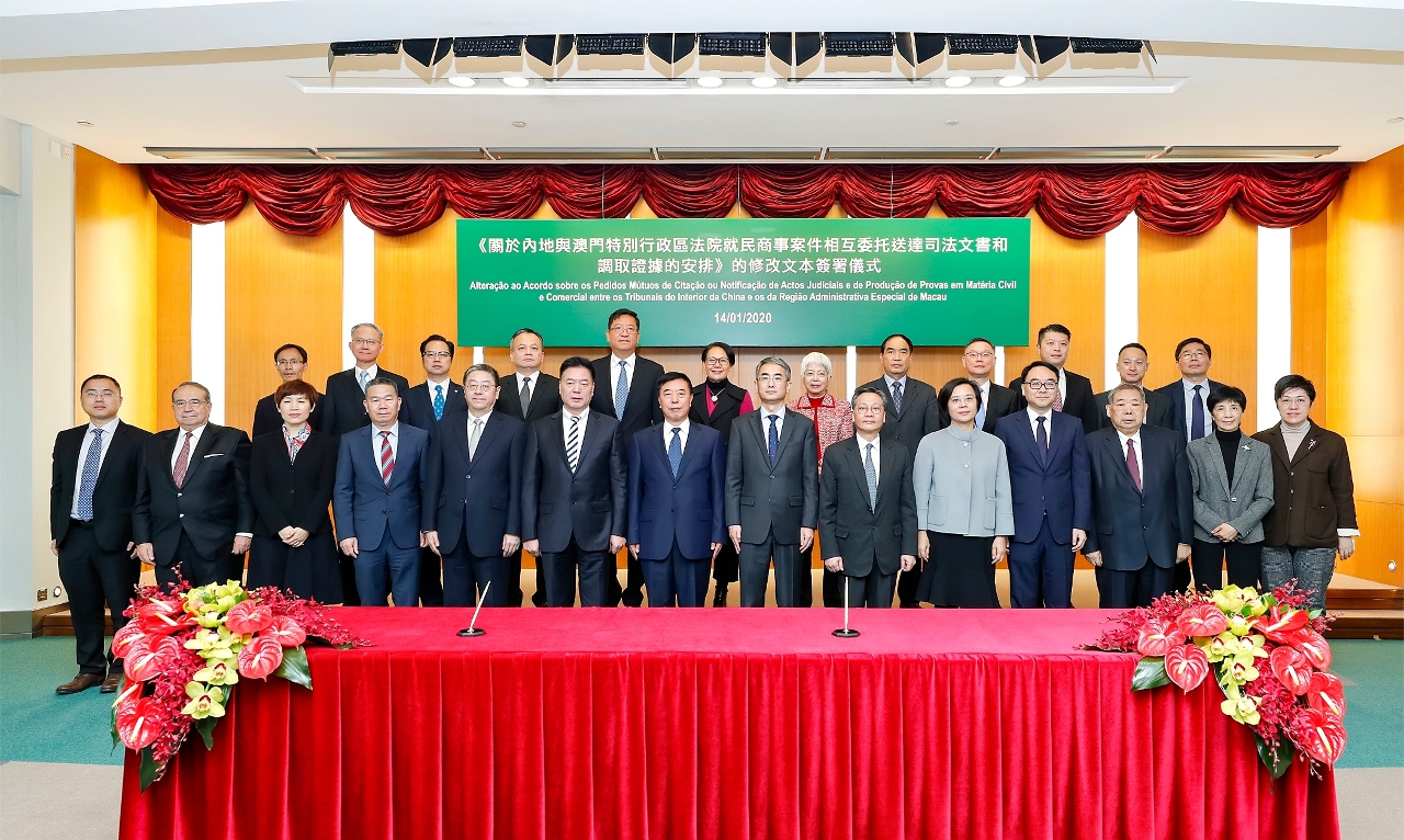 行政法务司司长张永春和最高人民法院副院长杨万明今(14)日在政府总部签署《关于内地与澳门特别行政区法院就民商事案件相互委托送达司法文书和调取证据的安排》的修改文本。原《安排》于二零零一年八月十五日签署。修改文本将于二零二零年三月一日生效。