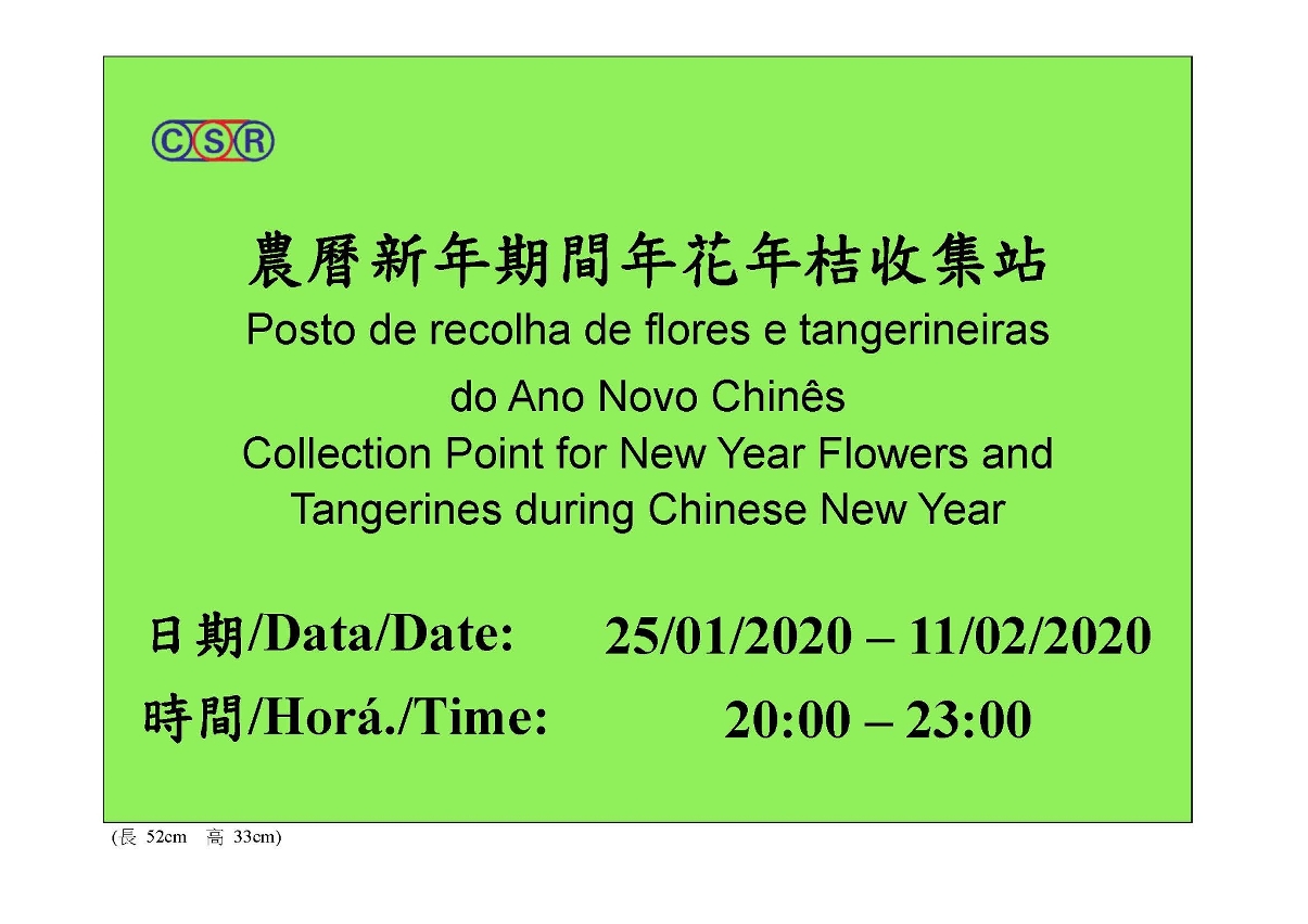 按照传统习俗,市民于新春期间亦会购置年花、年桔布置家居,故每年春节后有大量年花、年桔被弃置。市政署将于一月二十五日至二月十一日,将大体积垃圾收集站改为年花年桔收集站,并更换相关指示牌,以便市民知悉。市民可于上述期间的晚上八时至十一时,把弃用的年花年桔放置在收集站内,以便清运人员可以集中处理。