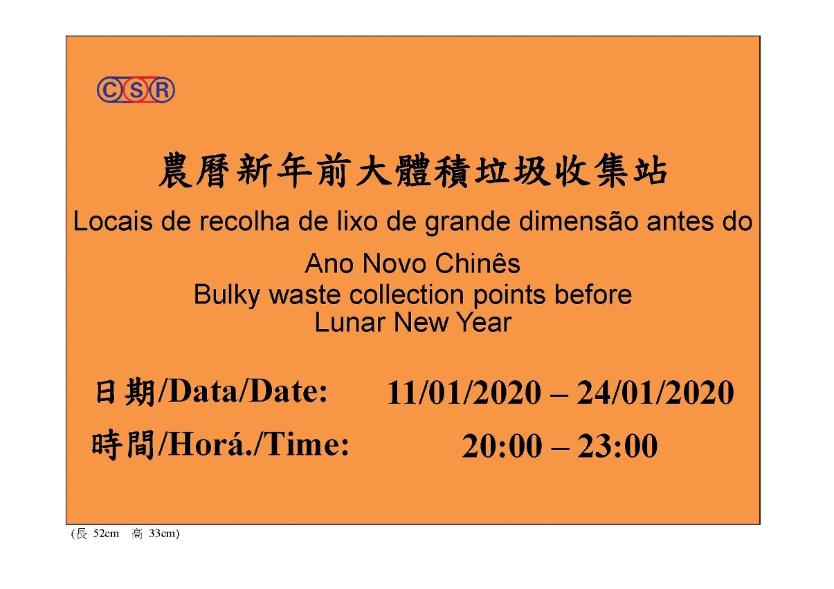 农历新年前夕,市民都有大扫除及更换大型家具的习惯,垃圾量相应增加,市政署联同澳门清洁专营有限公司于一月十一日至二十四日(农历年十七至三十)期间,在全澳设置一百三十二个大体积垃圾收集站,当中澳门半岛有一百零八个,氹仔有十五个,路环有九个。市民可于上述期间的晚上八时至十一时,将大体积垃圾弃置于以上收集站,并应注意摆放位置,避免影响行人及交通安全,同时亦须确保摆放稳固,以免造成意外。为方便市民识别收集站的位置,澳门清洁专营有限公司会于收集站旁设置指示牌,并透过刊登报章广告、张贴海报及于市政署网站www.iam.gov.mo及环境资讯网www.iam.gov.mo/macaohygiene发布相关资讯。