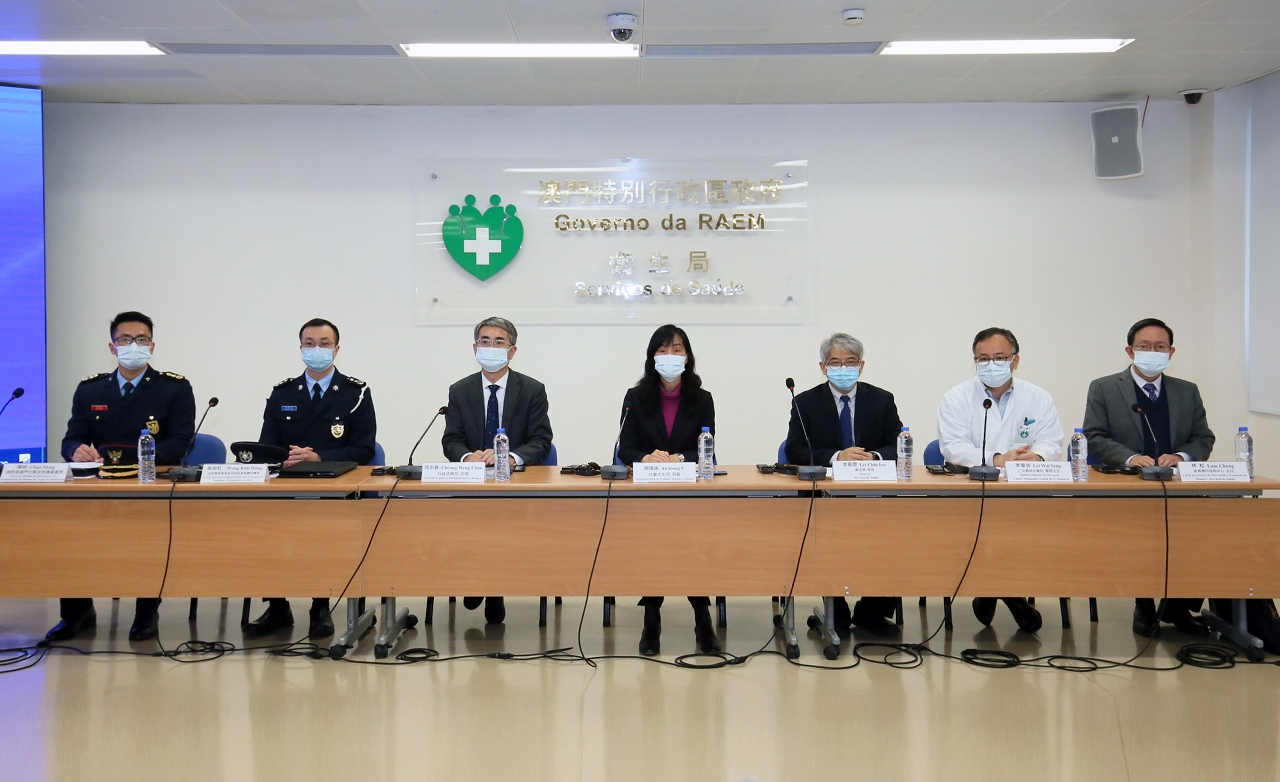 新型冠状病毒感染应变协调中心(下称应变协调中心)于今(28)日举行「新型冠状病毒最新情况及本澳各项防控措施」记者发布会,社会文化司欧阳瑜司长、行政法务司张永春司长、卫生局李展润局长、仁伯爵综合医院李伟成医务主任、疾病预防控制中心林松主任、治安警察局居留及逗留事务厅代厅长黄剑虹副警务总长、消防局行动及救护处处长陈明共同会见传媒。
