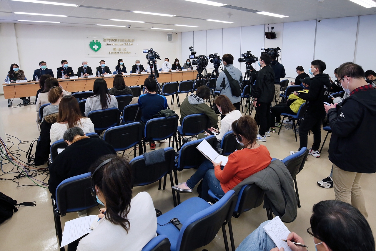 新型冠状病毒感染应变协调中心(下称应变协调中心)于今(2)日举行「新型冠状病毒最新情况及本澳各项防控措施」记者发布会,社会文化司欧阳瑜司长、经济财政司李伟农司长、卫生局李展润局长、劳工局黄志雄局长、仁伯爵综合医院李伟成医务主任、罗奕龙医务主任、疾病预防控制中心梁亦好协调员、治安警察局行动策划厅赵崇远厅长、教育暨青年局教育厅江毅厅长、旅游局执照及监察厅陈露厅长、社会工作局家庭及社区服务厅李丽萍厅长共同会见传媒。