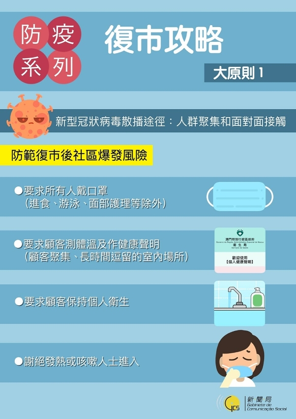 为防范复巿后增加社区内传播病毒的风险,强烈建议每位场所负责人在恢复营运前,必须熟读这份攻略和卫生局相关指引,大原则是对顾客进行适当管理。