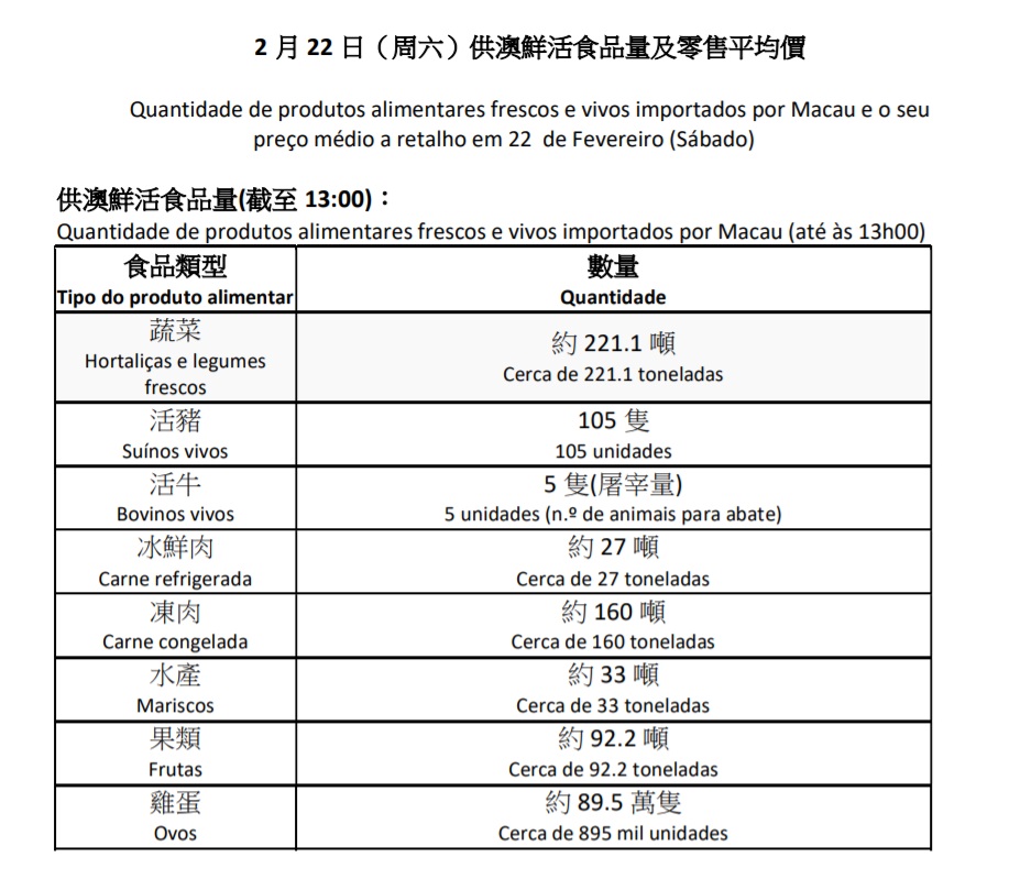 供澳鲜活食品量(截至13:00):