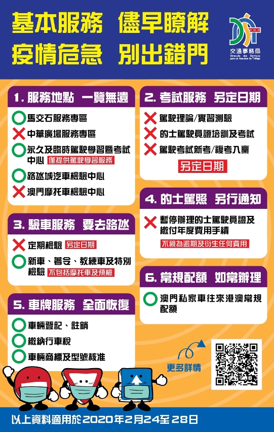 交通事务局在平衡新型冠状病毒疫情的发展与公众对基本服务的需求后,于2月24日(周一)至28日(周五),维持开放马交石服务专区、驾驶学习暨考试中心,以及路氹城汽车检验中心提供有限度服务,并同步恢复办理澳门私家车往来港澳常规配额、车辆登记、注销,以及缴纳俗称行车税的车辆使用牌照税等手续。而驾驶考试、的士驾驶员证培训和考试、的士驾驶员证办理手续则暂停至另行通知,以减低疾病传播的风险。