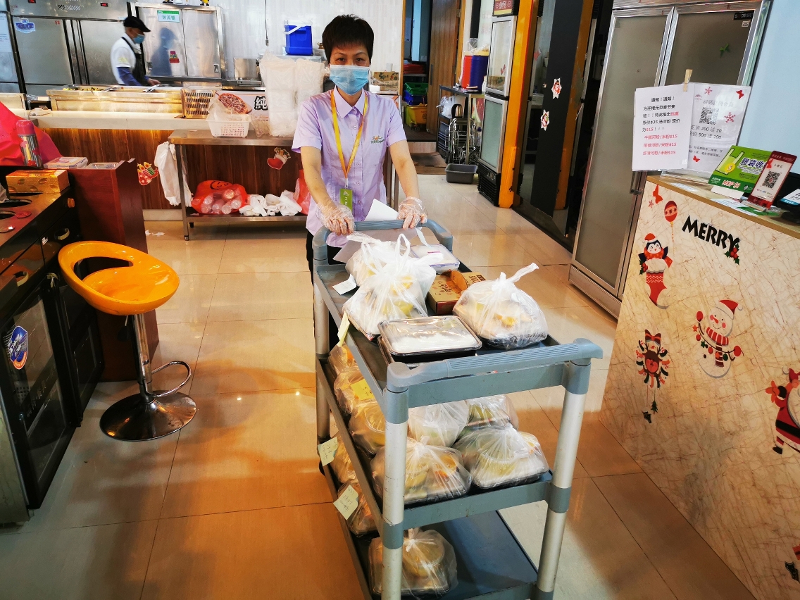二月初至今,校园超市负责人张英宏几乎每天早上工作到深夜,确保货物供应稳定。疫情初期很多供货商不营业,因此张英宏与同事安排了专人专车运货到校园。二月初该超市还额外增加生鲜肉类的供应,确保师生买到足够食材。