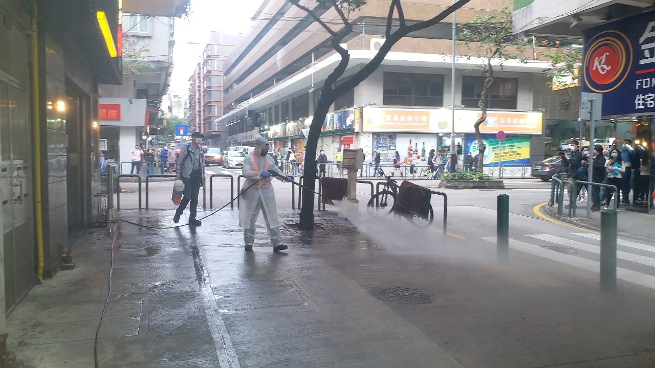 配合防控工作,市政署今日(三月十八日)即时协调清洁专营公司及外判清洁加派人手,于本澳第十五例确诊病例居所周边街道、大厦各楼层梯间等公用空间进行大型清洁及消毒工作,尽力减低传染病传播的条件。