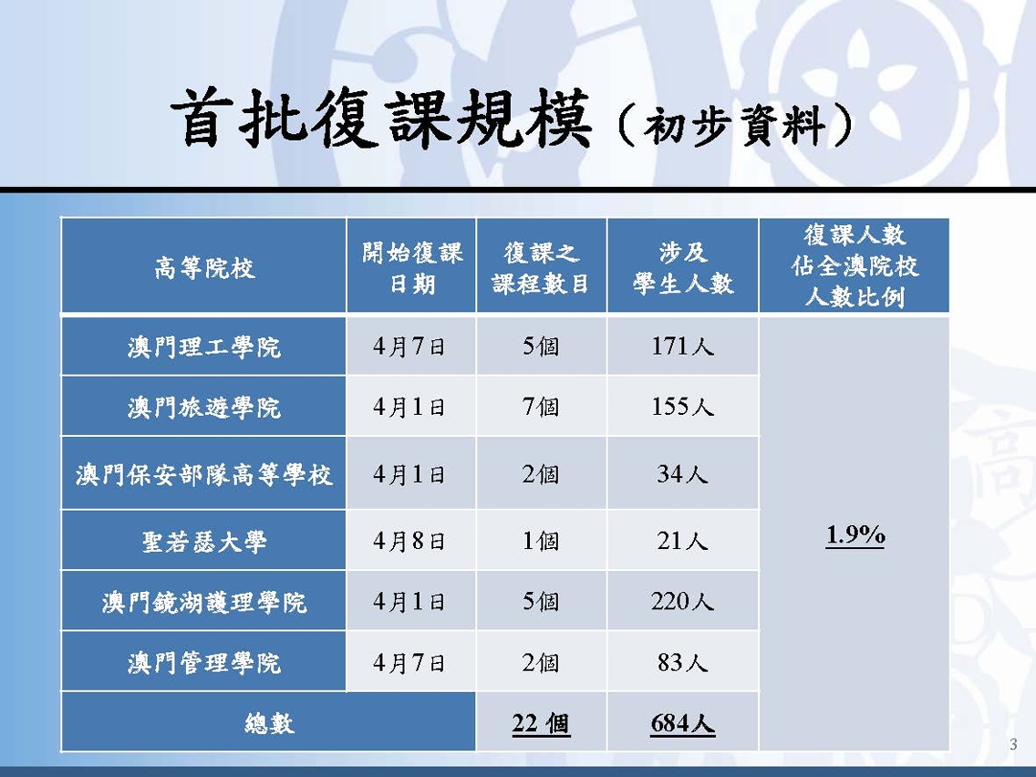高等教育局表示,4月1日开始,6所高等院校个别班级,可以在首阶段有条件复课,当中有22个课程,占全澳院校课程7.3%,涉及684名学生,占全澳院校学生1.9%。