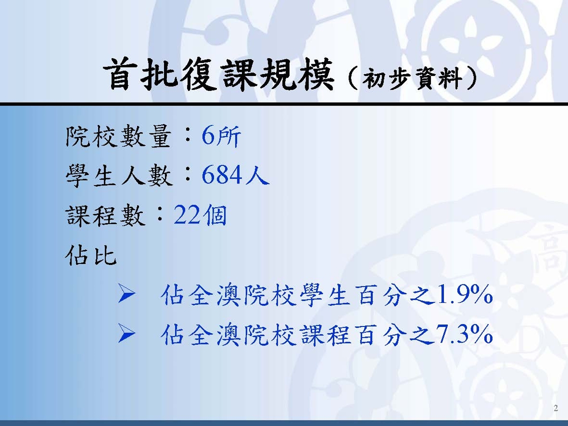 4月1日开始复课的院校包括澳门旅游学院、澳门保安部队高等学校及澳门镜湖护理学院,共有14个班级,涉及409位学生。4月7日开始复课的院校包括澳门理工学院、澳门管理学院共有7个班级,涉及254位学生。另外,圣若瑟大学会在4月8日开始复课,共1个班级,涉及21人。