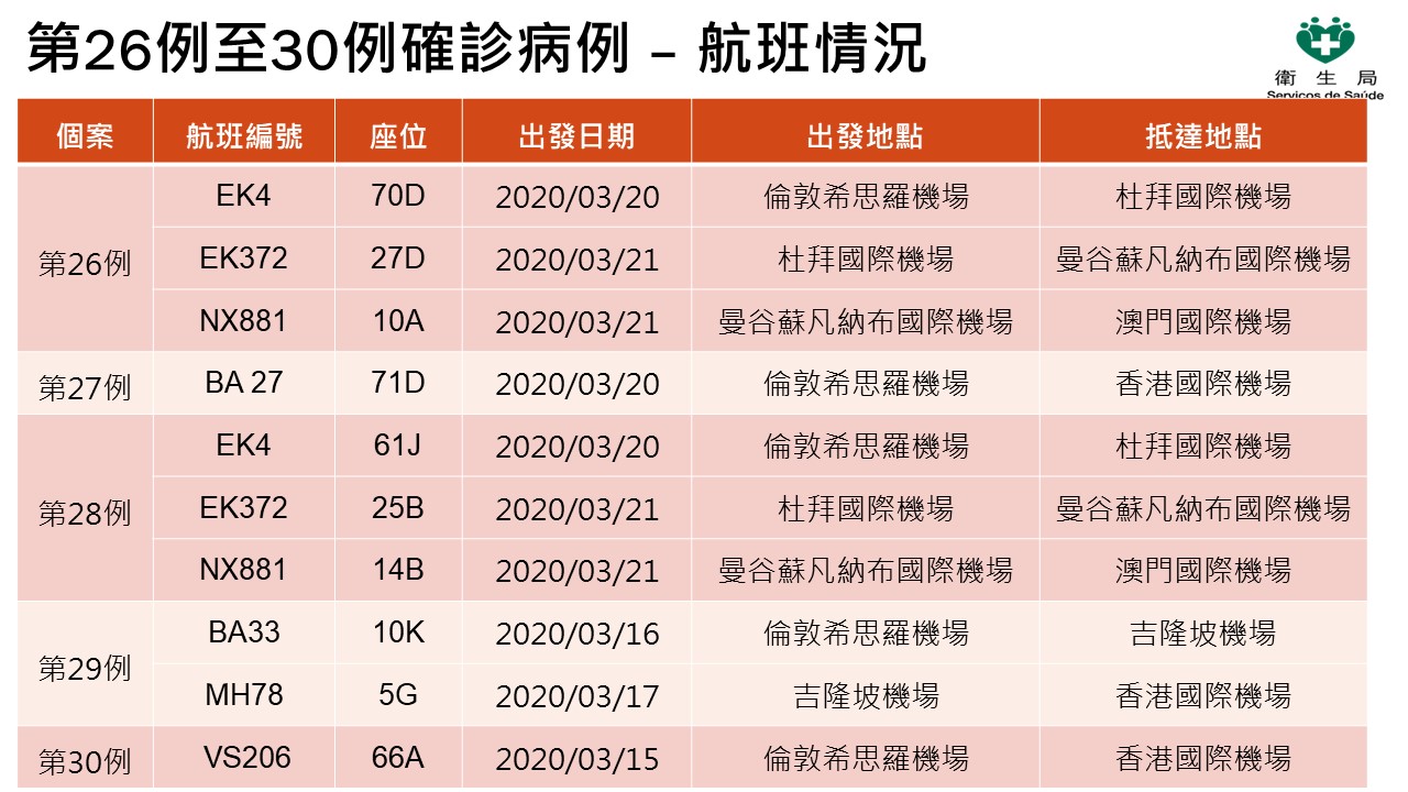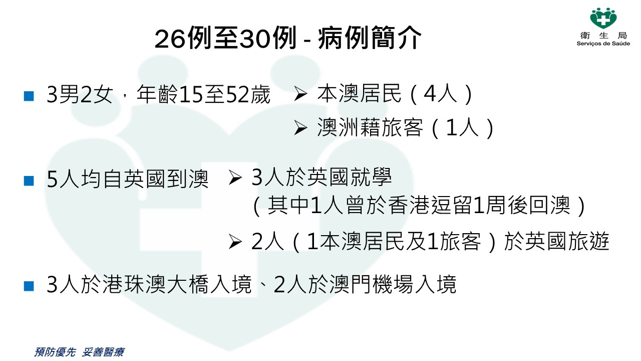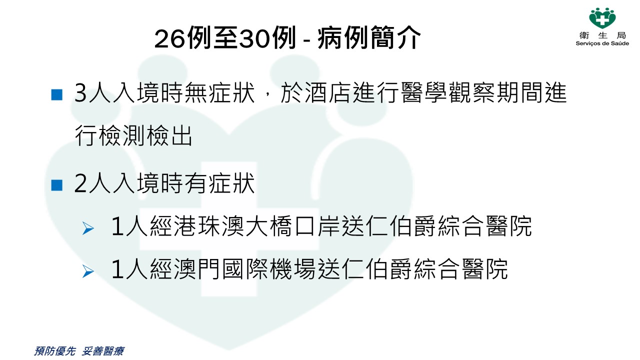 应变协调中心表示,第30例患者为澳洲籍旅客,本月16至20日入住路环澳门竹湾酒店,期间主要在酒店及海滩逗留,只于19日曾离开酒店,乘坐26A巴士。经评估后,由于他主要在户外较开扬的地方逗留,且全程有佩戴口罩,相信传播病疫的风险较低。
