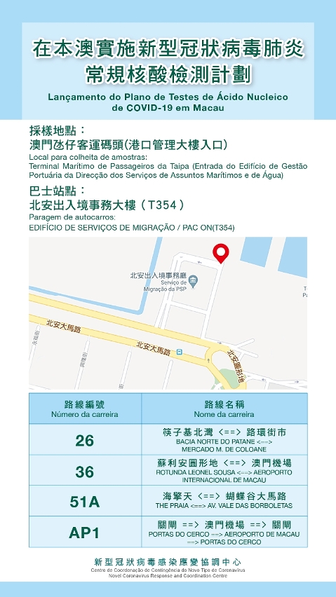「澳门居民常规核酸检测计划」已于昨(7)日早上9时开始,罗奕龙医生回应相关提问时表示,检测工作主要由卫生局和国检(澳门)卫生检测有限公司合作提供,卫生局方面,截至今日中午12时,过去24小时共完成 1,334人采样。而当局为方便市民前往设于氹仔客运码头(港口管理大楼入口)的提供核酸检测服务点,已在网上预约系统内显示相关巴士路线讯息(见附图),亦会在现场加设标示,让市民更容易找到入口。