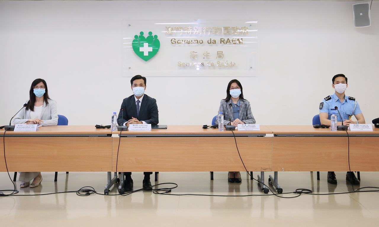 新型冠状病毒感染应变协调中心于今(8)日举行例行记者会,仁伯爵综合医院罗奕龙医务主任、旅游局执照及监察厅陈露厅长、治安警察局公共关系处李德辉处长、疾病预防控制中心传染病防制暨疾病监测部梁亦好协调员共同会见传媒。