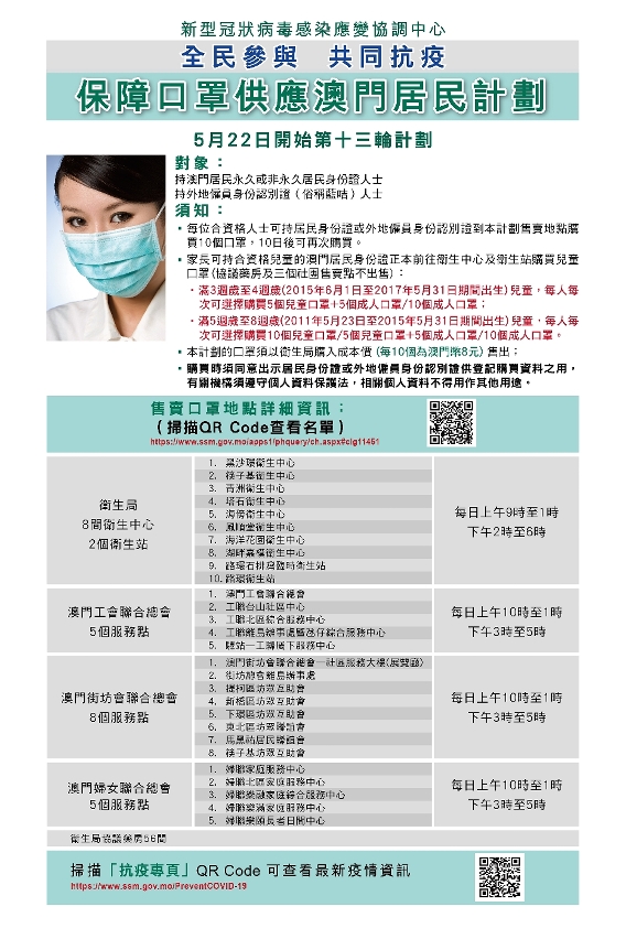 第十三轮计划的实施方式、售卖点及售卖时间等与第十二轮相同,对象为本澳永久及非永久居民、持外地雇员身份认别证(俗称蓝咭)人士;卫生局辖下卫生中心及卫生站、卫生局协议药房、本澳三个社团(工联、街总、妇联)继续提供售卖口罩服务,即全澳共有84个售卖点,详情见附图。