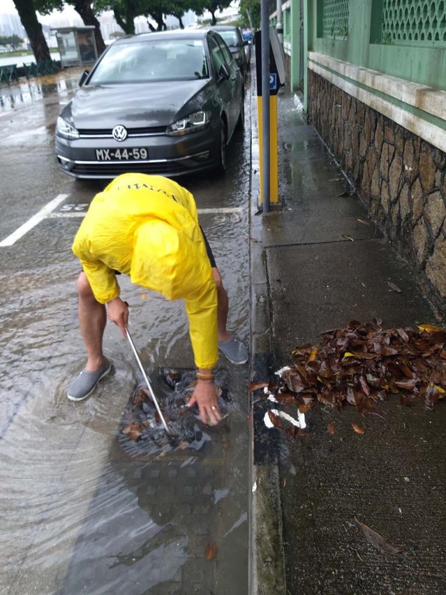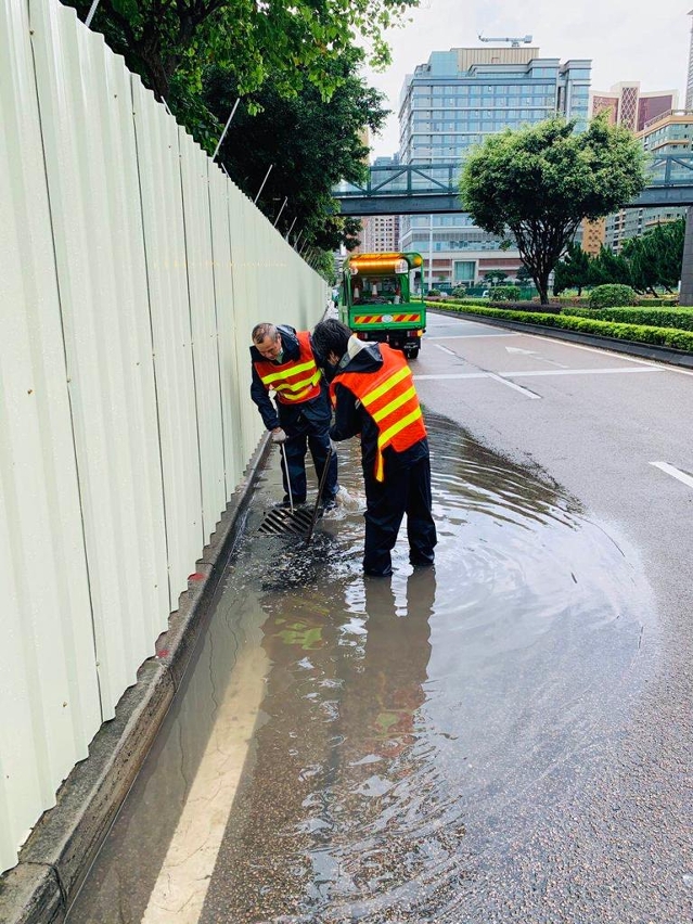 因应强降雨时间持续,渠道积聚大量雨水,新桥、台山、内港及氹仔旧城区相继出现水浸现象,其中台山超过180毫米降雨。而因海潮高度达2.1米,减低了雨水渠的排洪能力。为此,市政署即时启动暴雨应变机制,派员到各雨水泵房巡查,开启水泵以排洪。同时,分别派员及要求外判清渠公司往低洼地区进行紧急清理路边雨水井工作,清走积聚渠口垃圾,打开渠盖加快排洪。