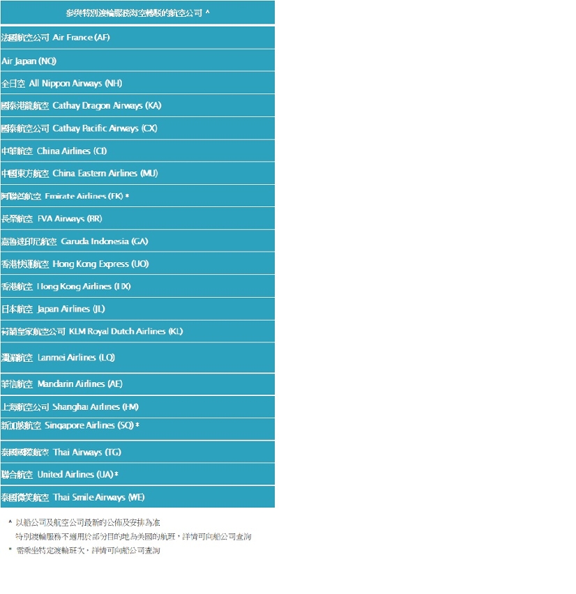● 特别渡轮服务不适用于部份目的地为美国的航班,详情可向船公司查询。