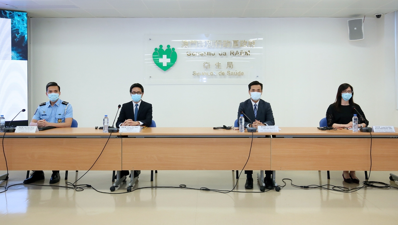 新型冠状病毒感染应变协调中心于今(15)日举行例行记者会,旅游局程卫东副局长、仁伯爵综合医院罗奕龙医务主任、治安警察局行动及通讯处马超雄处长、疾病预防控制中心传染病协调员梁亦好医生共同会见传媒。