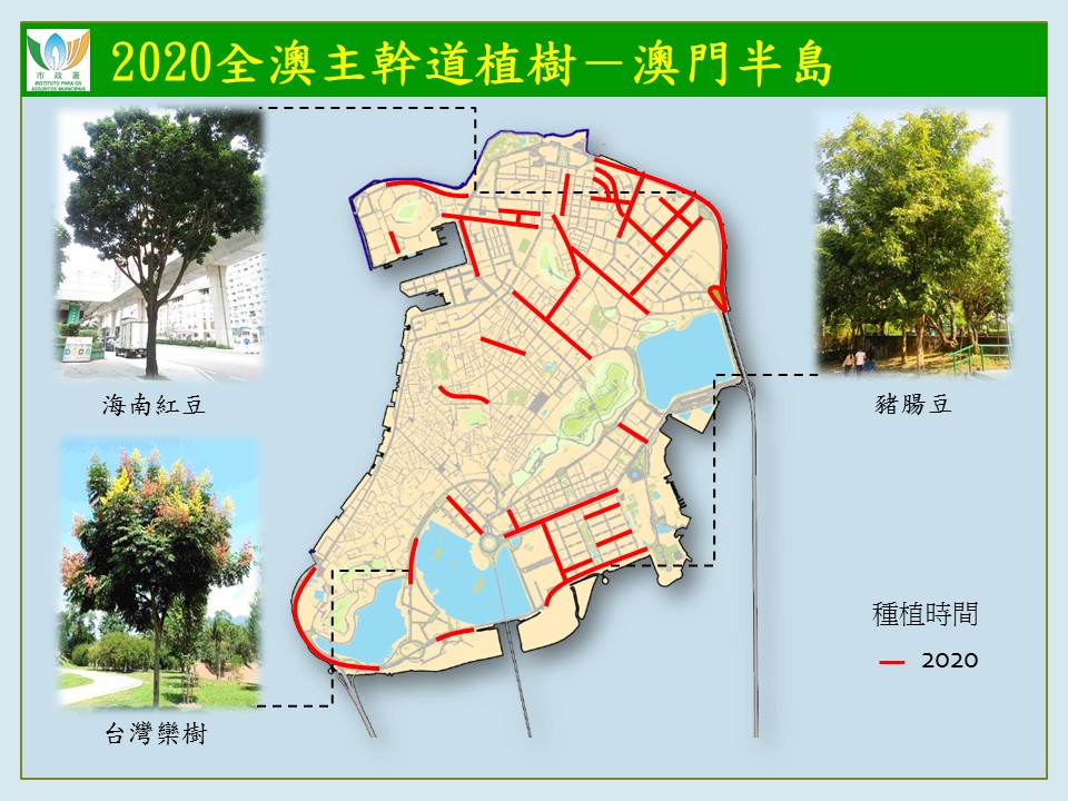 二零二零年主干道植树计划现已有序展开,计划共种植约一千八百株树,已种植地点包括望德圣母湾大马路、霍英东博士大马路,体育馆大马路及广东大马路等。下半年将继续在马度博士大马路、四月二十五日前地、马场北大马路至友谊桥大马路、孙逸仙大马路及休憩区、氹仔轻轨沿线、北安大马路至伟龙马路、机场大马路、体育馆大马路、莲花海滨大马路、黑沙马路、贾梅士大马路及石排湾公屋群周边道路种植树木。