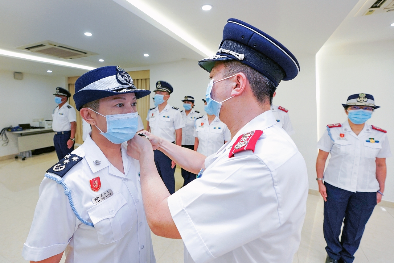 澳门海关今日(8日)下午在海关总部举行关务总长晋升仪式,获晋升者吴嘉慧在黄文忠关长及一众官员的见证下进行宣誓,其后由海关关长为其戴上新肩章,晋升成为关务总长。