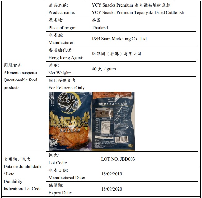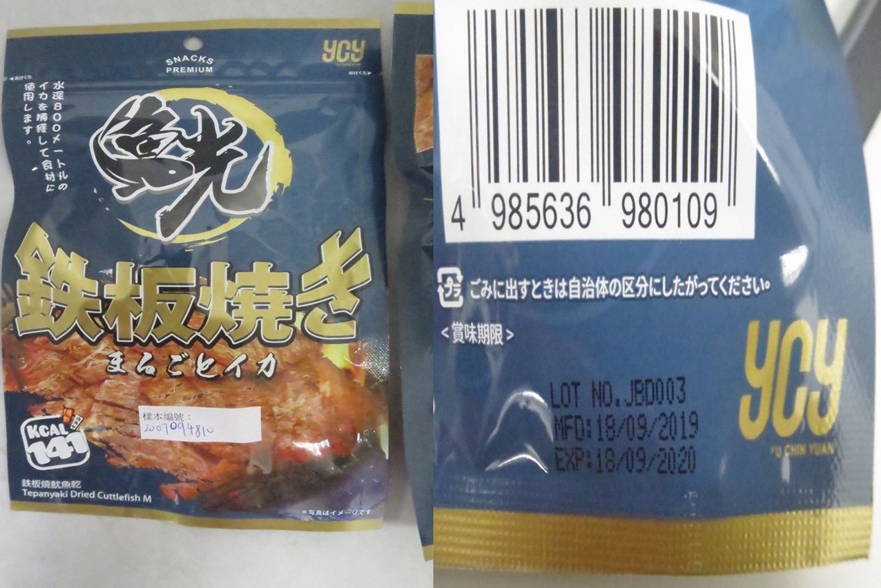 市政署恒常对本澳各零售点的食品抽检工作中,发现一款名称为“鱼光铁板烧鱿鱼干YCY Snacks Premium”的预包装零食有明显发霉的情况。涉事产品的产地为泰国,净重四十克,批次为LOT NO. JBD003;生产日期为18/09/2019;保质期为18/09/2020。市政署食品安全厅已即时采取跟进措施,勒令涉事商户停售有关问题批次产品,并追溯产品的来源及销售流向;同时,向本地食品供应及零售商发出食品预警;由于涉事产品经香港供应商所提供,市政署亦已通报香港食安部门知悉及跟进事件。