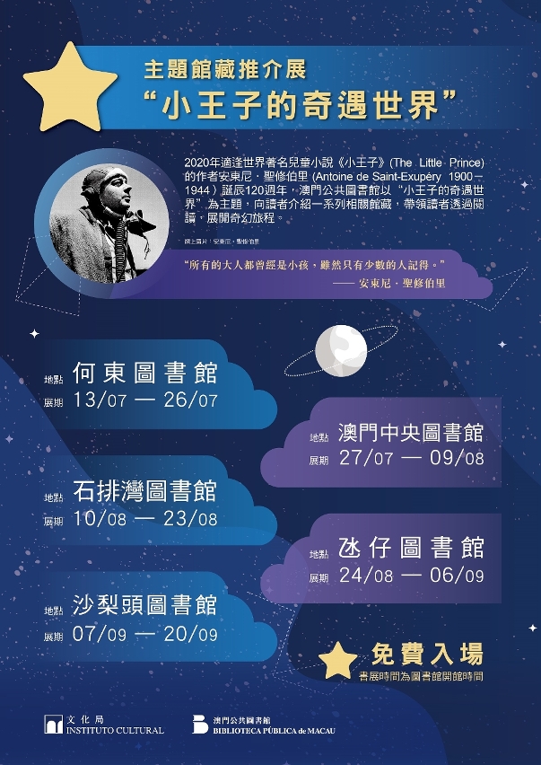 适逢世界着名儿童小说《小王子》(The Little Prince)的作者安东尼.圣修伯里(Antoine de Saint - Exupéry 1900 - 1944)诞辰120周年,文化局公共图书馆于7月13日至9月20期间举办“小王子的奇遇世界”主题馆藏推介展,并分别于何东图书馆、澳门中央图书馆、石排湾图书馆、氹仔图书馆以及沙梨头图书馆巡回展出60多本与小王子、其作者安东尼.圣修伯里、飞行与天文相关的馆藏实体图书、电子书及电子杂志,带领读者透过阅读,展开奇幻旅程。展览免费入场,欢迎市民参观。