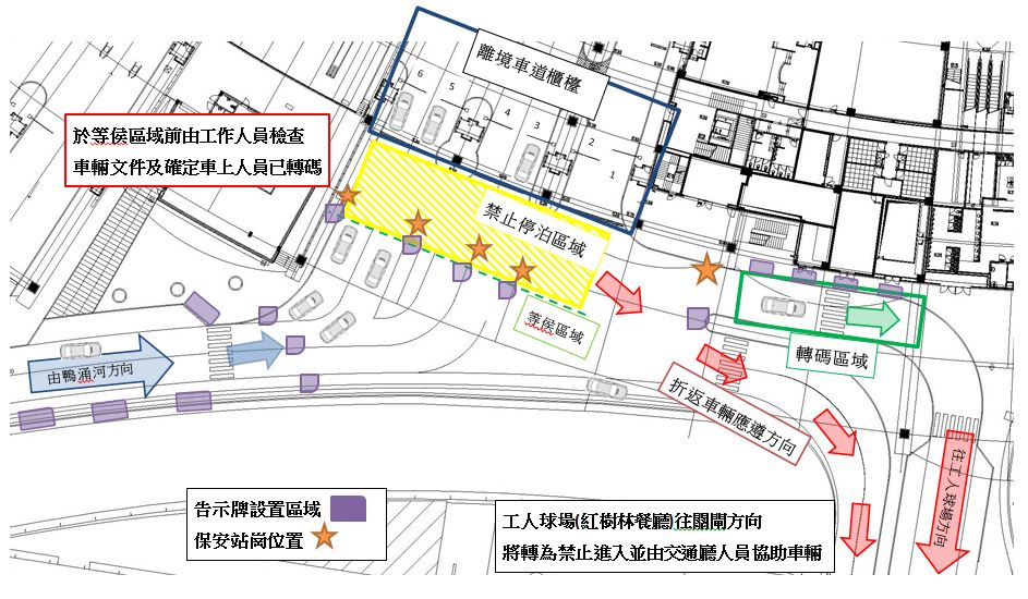 获批准经关闸口岸离境的两地牌车主须留意,现阶段只可使用何贤绅士大马路一侧的离境车道离境,关闸广场近工人体育馆一侧的离境车道将禁止驶进,治安警察局会预留有关车道给不符合条件的车辆作折返之用。