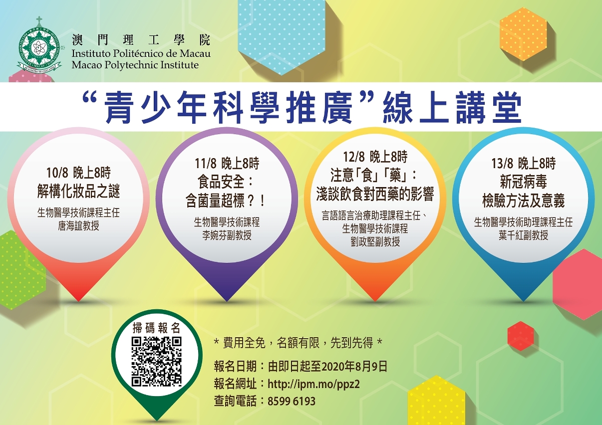 为增强青少年对科学的学习兴趣,推动积极参与科普活动,澳门理工学院举办暑期“青少年科学推广”线上讲堂,向青少年讲解涉及化妆品和个人护理产品、食品安全、食物与药物相互作用及新型冠状病毒检验等内容,介绍生活中的趣味科学,欢迎有兴趣人士报名,费用全免,先到先得。