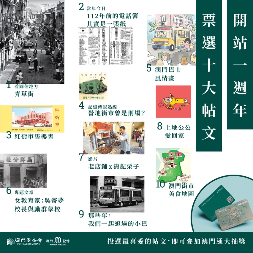 澳门基金会的“澳门记忆”文史网(www.MacauMemory.mo)自2019年8月6日开站以来,致力与社会各界分工协作,共同推广澳门历史文化。适逢开站一周年,本月将陆续开展多项线上活动,并以社交媒体抽奖活动拉开序幕,欢迎市民踊跃参与,共建、分享及传承小城记忆。