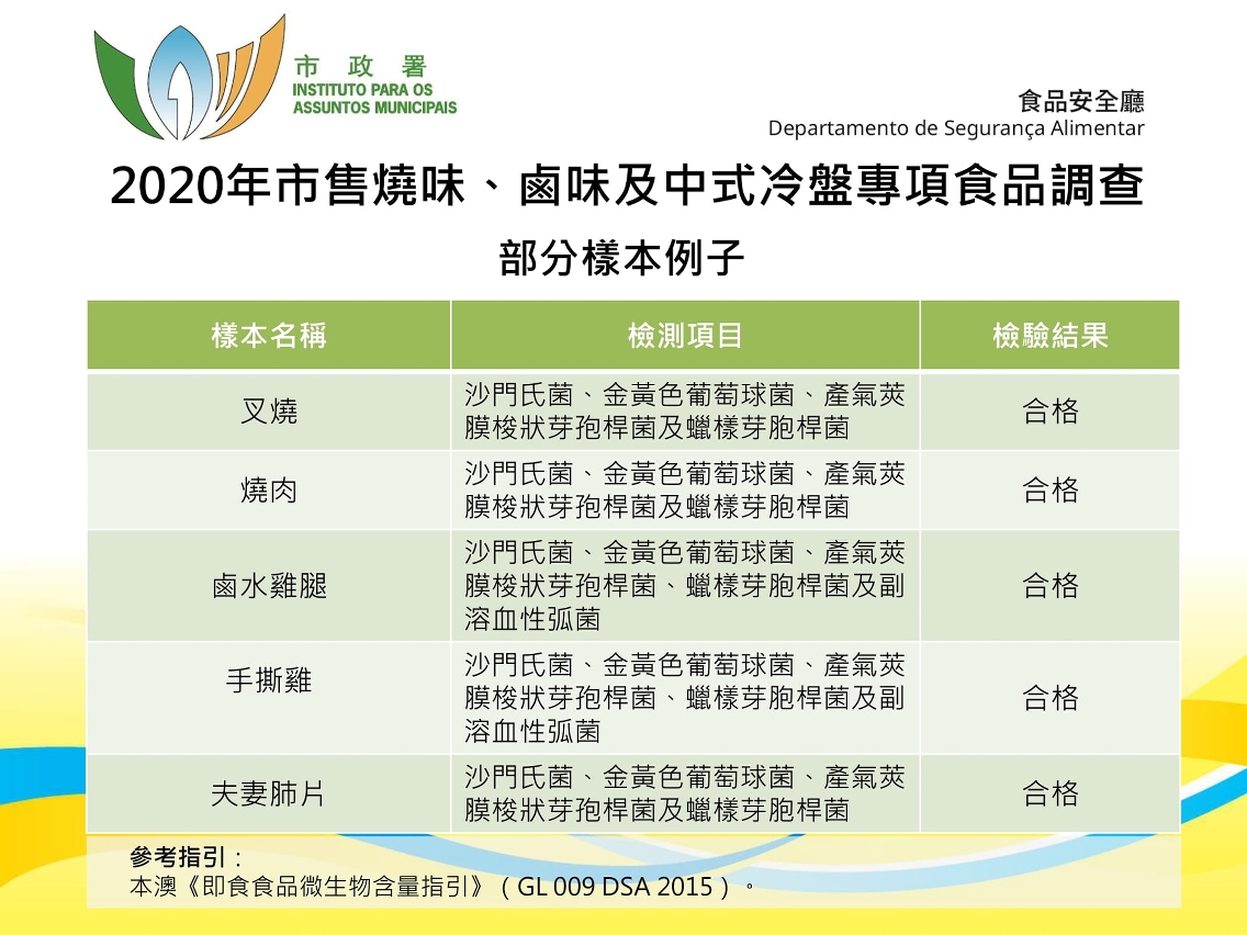 为瞭解本澳市售烧味、卤味及中式冷盘的卫生安全情况,市政署进行专项食品调查,于市面抽查了合共四十个相关食品样本,进行致病性微生物检测,结果显示所有样本均未见异常。
