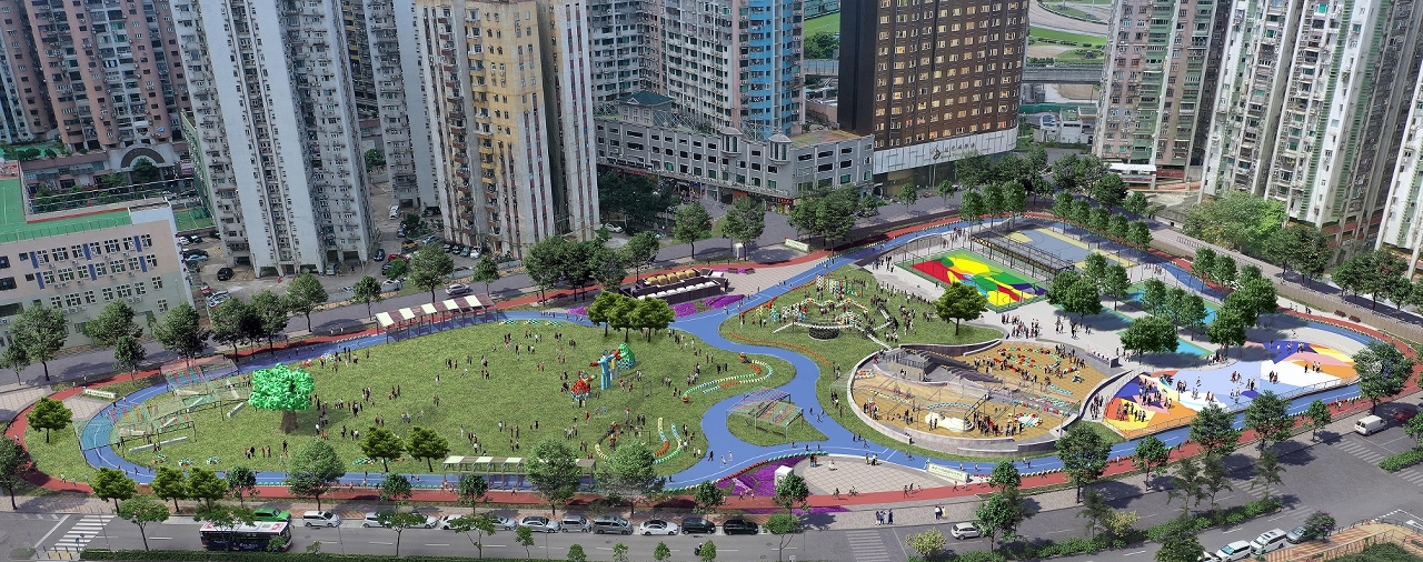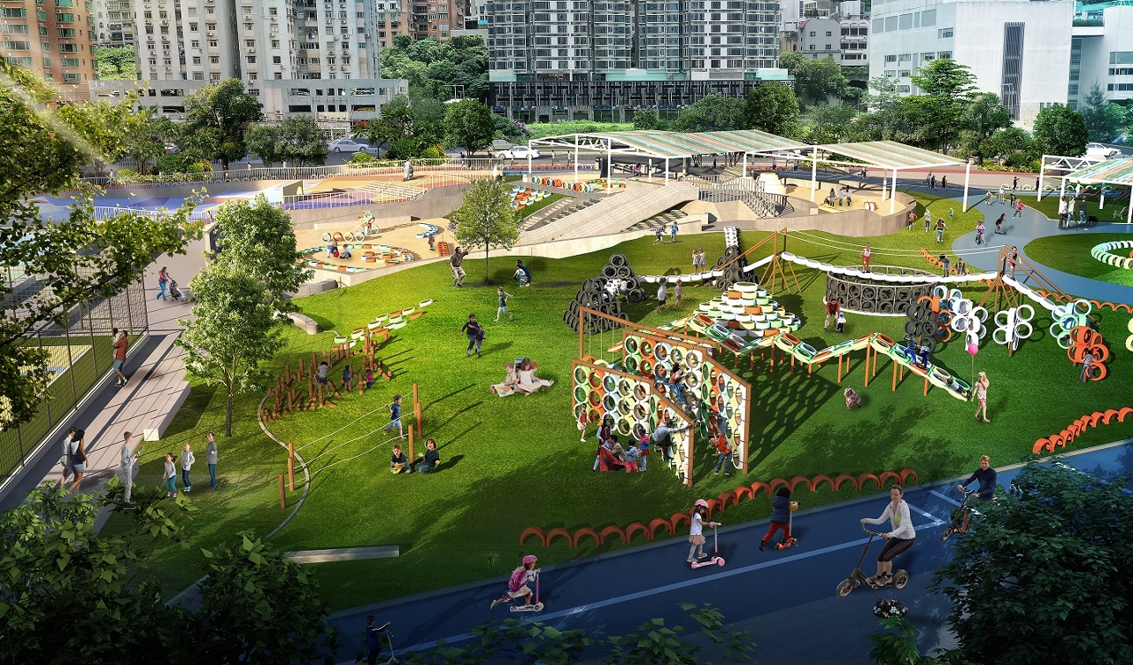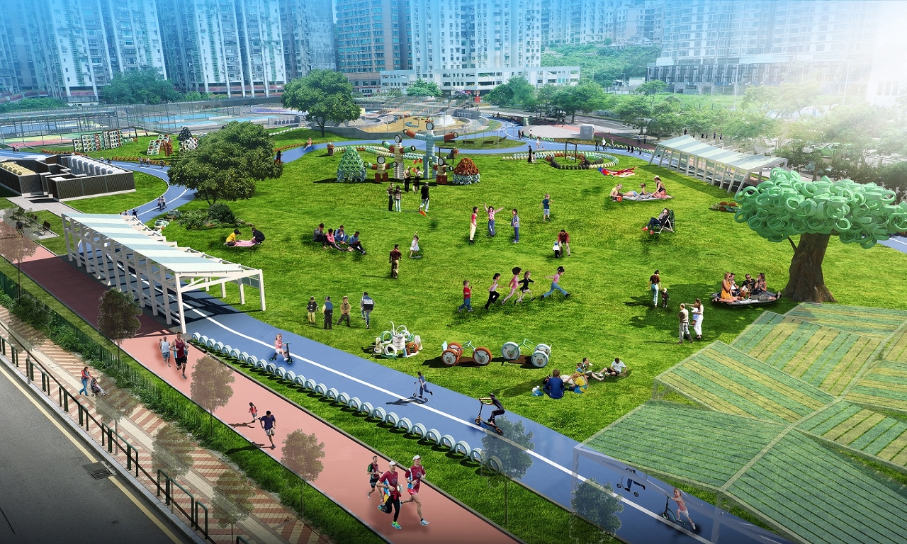 规划中的车胎公园,以节约环保、返朴归真为原则,因地制宜,利用高低起伏的原地型作整体布局,以车胎为主设计元素,串连园内车胎乐园、亲子草地、欢乐山丘、水沙世界、滑板天地、开心波地、环园跑步径、环园小童滑板车道等各个功能区,为不同年龄层的居民提供动静皆宜的亲子互动、康乐游乐空间。