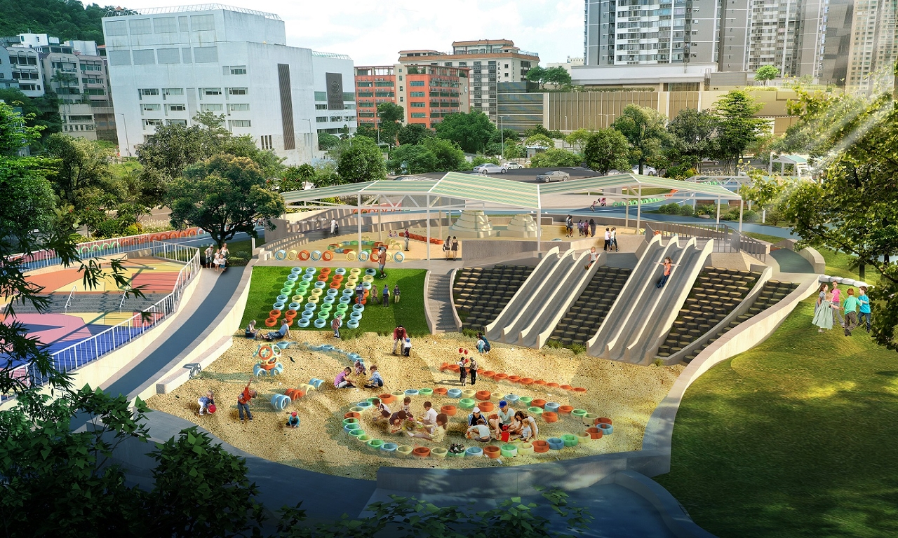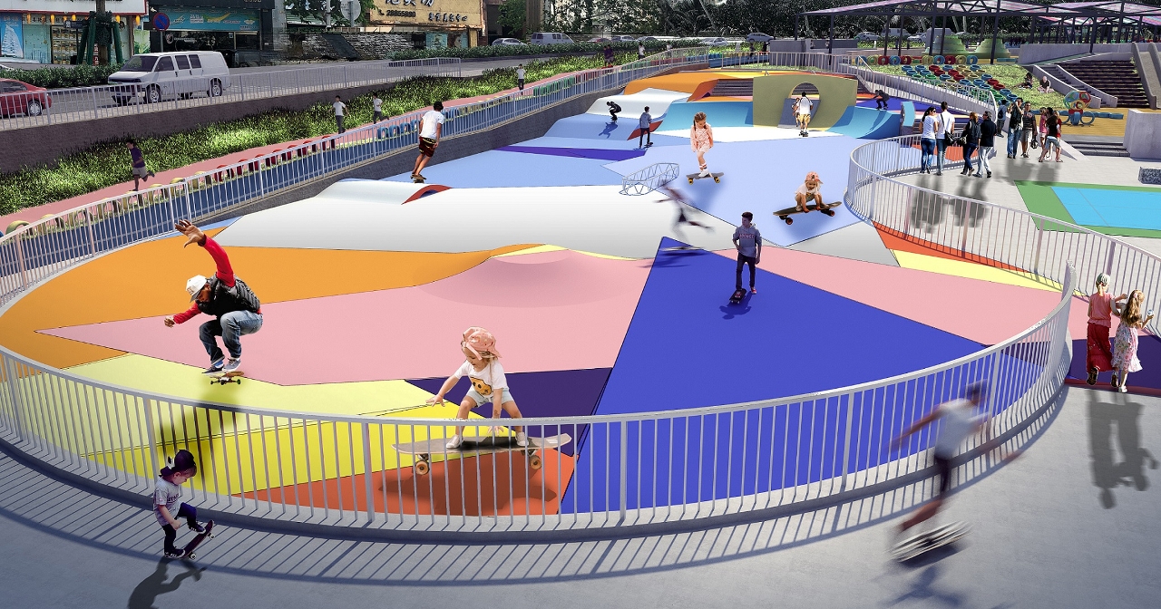 面向青少年的滑板天地,适合初学者及中阶人士,利用原地型的高低落差而建,地面配以几何色块衬托充满活力的形象。开心波地,设有足球场、篮球场、排球场及羽毛球场,周边将设置健身设施、鹅卵石步道、遮阳廊及长椅等。
