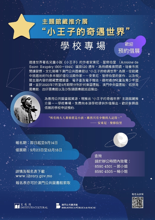 为持续推广阅读,培养市民阅读习惯,文化局辖下澳门公共图书馆推出“小王子的奇遇世界”主题馆藏推介展──学校专场,费用全免,申请期由即日起至9月14日,借展期为9月23日至12月18日,欢迎本澳学校申请预约借展,每校借展为期2星期,名额有限,先到先得。