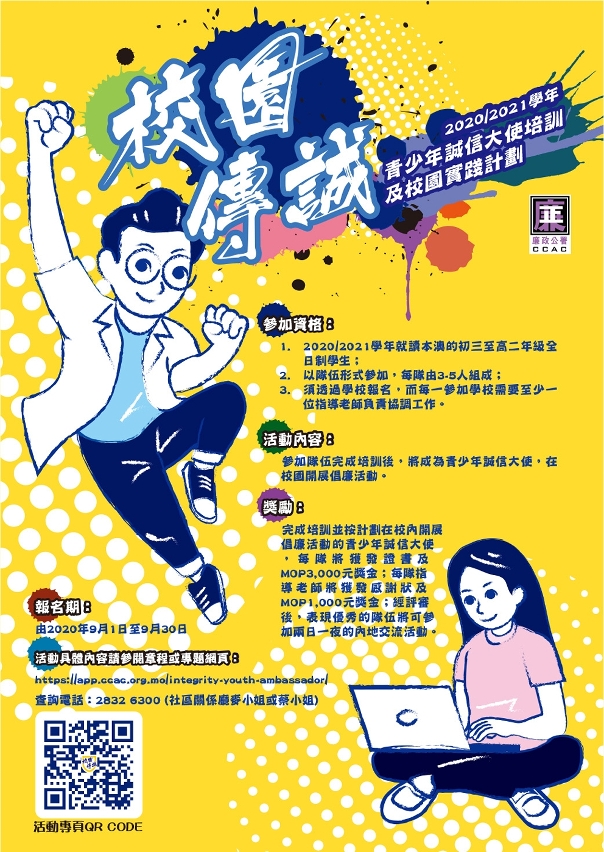 廉政公署首次举办“校园传诚”— 青少年诚信大使培训及校园实践计划,进一步向青少年宣扬廉洁诚信的讯息,鼓励青少年将廉洁意识积极带入校园及生活各层面,欢迎就读本澳初三至高二年级全日制学生透过学校报名参加,报名期至本月30日。