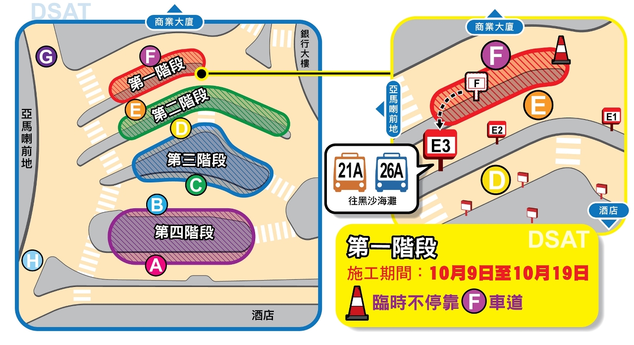 是次加建雨篷工程分四阶段进行,配合每个阶段的施工范围,涉及的巴士路线作出相应的临时停靠调整,首阶段先临时不停靠F车道的巴士路线(详见附表),交通事务局呼吁乘客留意,巴士公司并会加派人员在场维持秩序和指引乘客候车,详情可浏览交通事务局网页www.dsat.gov.mo。