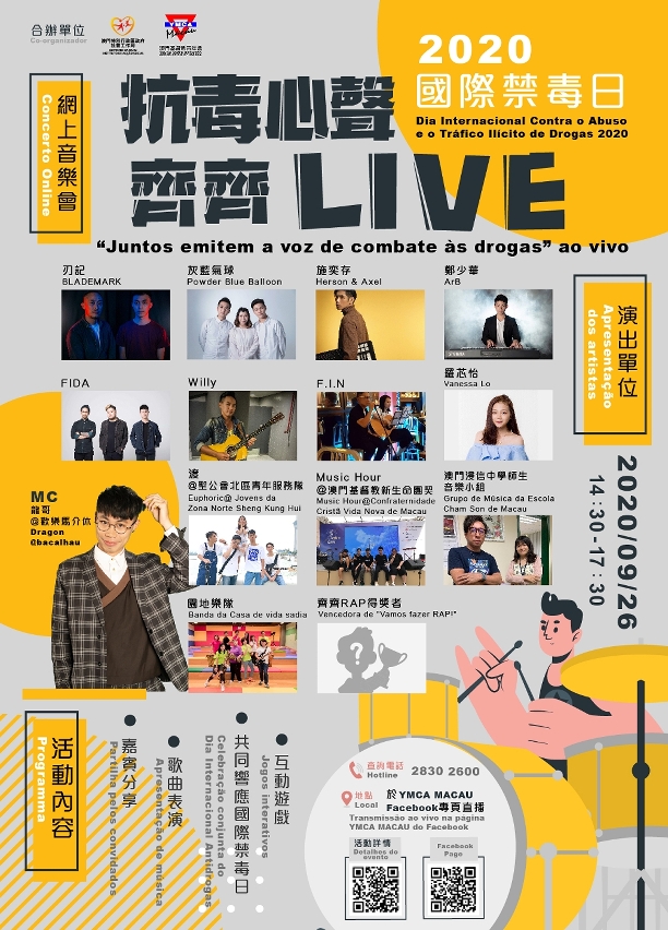 2020国际禁毒日压轴活动“抗毒心声齐齐LIVE” 网上直播音乐会,在健康生活教育园地和文艺门两个场地内,设有摇滚、声学、流行金曲及网红四个场景,将于本年9月26日(星期六)下午二时半至五时半在YMCA MACAU的Facebook专页,以网上直播和互动的形式,由获邀的表演者包括:刃记、灰蓝气球、施奕存、郑少华、FIDA、Willy、F.I.N、罗芯怡等本澳着名歌手、音乐组合,学校、社服机构,以及“抗毒心声齐齐RAP”的优秀作品得奖者作现场表演。另外,欢乐马介休的龙哥将担任活动司仪,届时带动各场景的表演者与收看直播的观众进行互动,并有即时抽奖环节,欢迎全澳市民踊跃参与,支持一众表演者以音乐传播健康无毒的生活讯息。