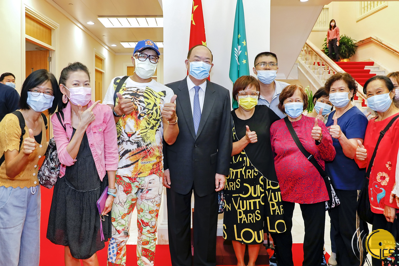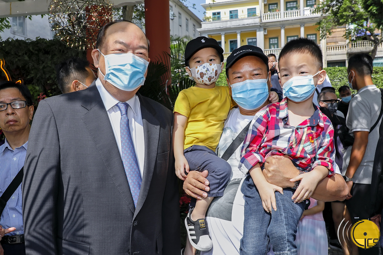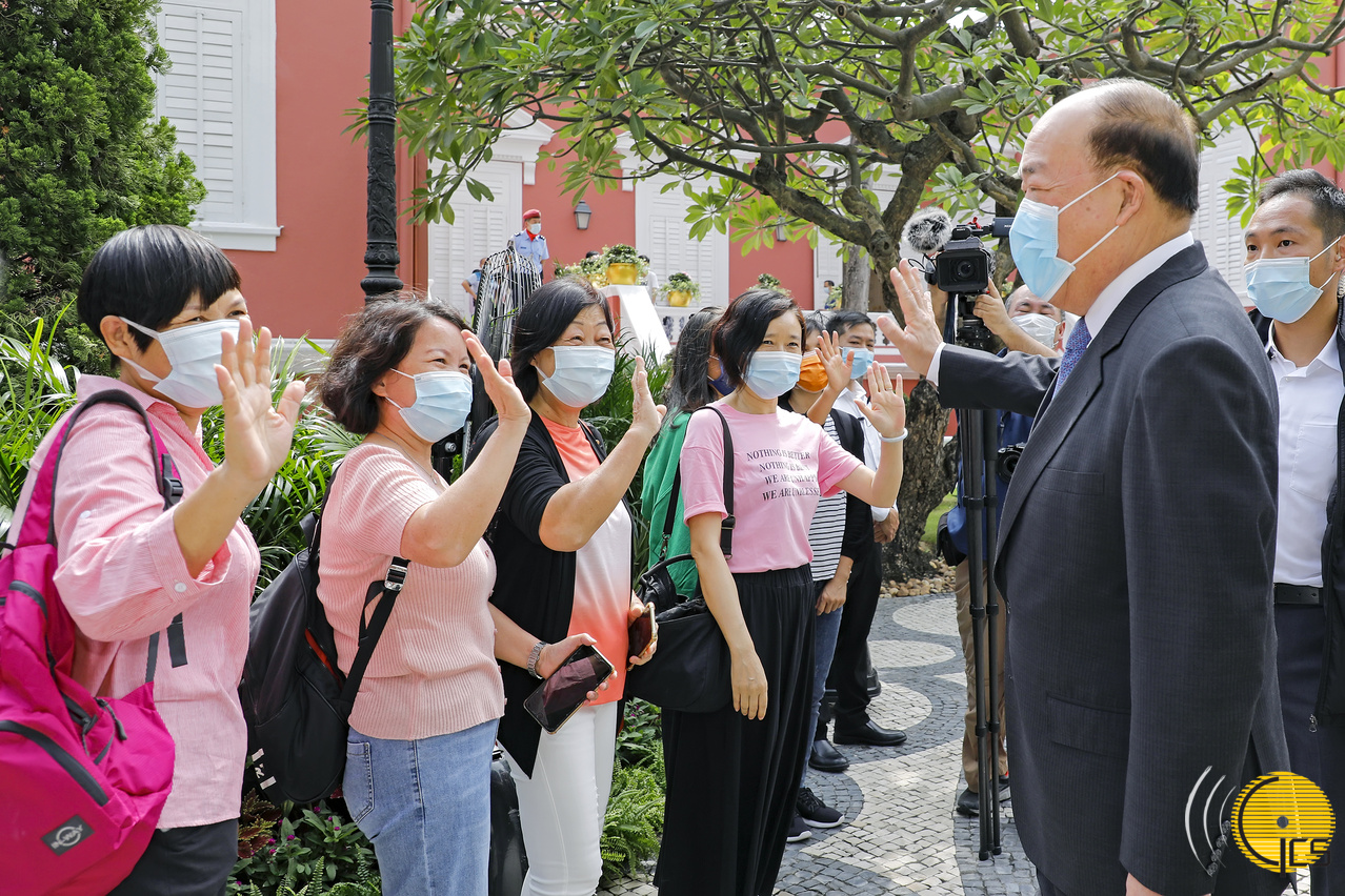 澳门特别行政区政府总部今(17)日起一连两天对外开放,行政长官贺一诚今早到政府总部欢迎到访的居民及游客,彼此亲切交谈及一起合影留念。