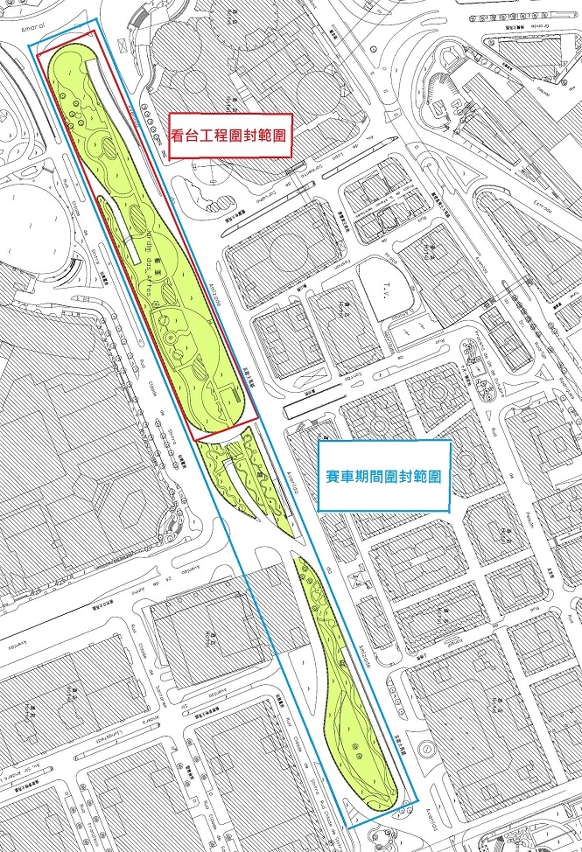 因应大赛车看台工程,由即日至十二月十五日位于亚马喇前地至广州街一段的艺园范围,以及由即日至十二月四日位于友谊大马路近澳门格兰披治赛车大楼一侧之水塘公园范围,须暂停开放。另外,由十一月九日至二十七日,水塘公园增加暂停开放区域至近海立方对面一侧。