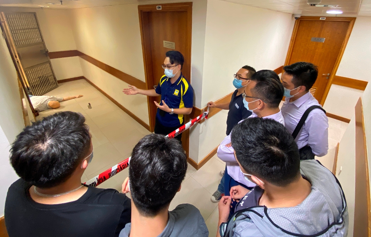 为加深学员对大厦管理防罪知识的理解和记忆,司警局人员特意设置了模拟案发现场,向他们讲解正确应对罪案和保护案发现场的方法。此外,司警局人员还与学员就日常大厦管理工作中可能遇到的各种治安问题进行互动交流,逐一解答他们的疑问,冀能帮助他们更好地管理和维护大厦的治安环境,警民合力防范罪案发生。
