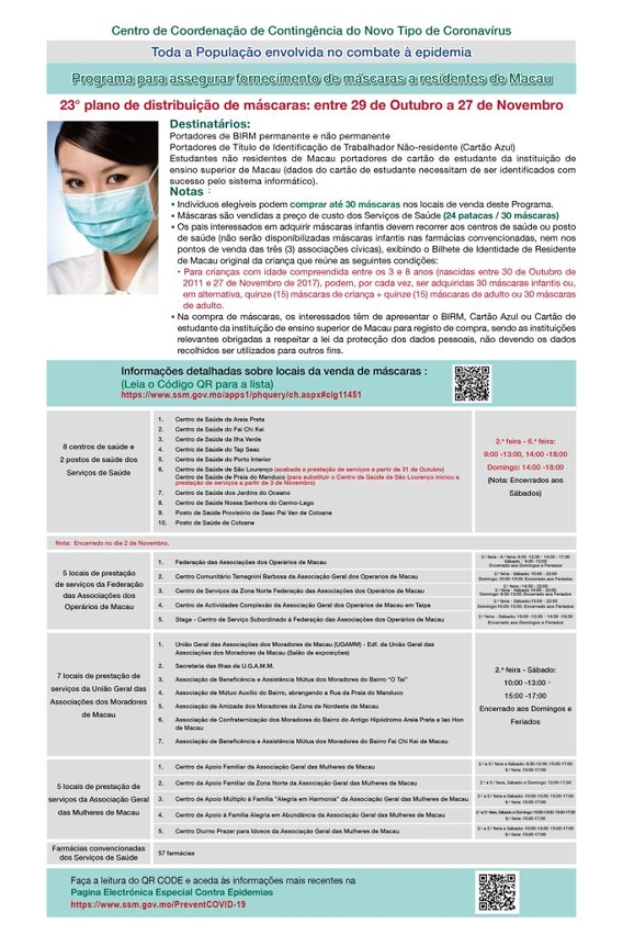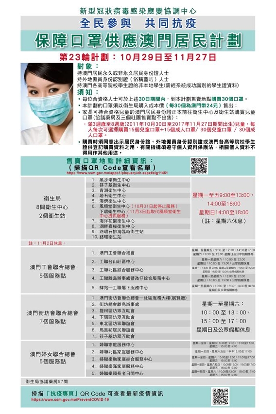 新型冠状病毒感染应变协调中心今(26)日公布,第23轮保障口罩供应澳门居民计划于本周四(29)日开始,售卖期间为30日,即10月29日至11月27日,期间每人可一次性购买30个口罩,售价合共24澳门元。