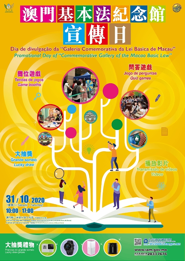 为积极推动市民对《宪法》与《基本法》以及「一国两制」有更多认识,加深爱国爱澳情怀,市政署将于十月三十一日(星期六)举办「澳门基本法纪念馆宣传日」活动,透过摊位游戏、影片播放等环节,寓教于乐地进行推广。凡参加当日问答游戏并答案全对者,将可参与大抽奖环节,有机会获得电子产品、家庭电器及购物券等丰富大奖,欢迎市民踊跃到场参与。