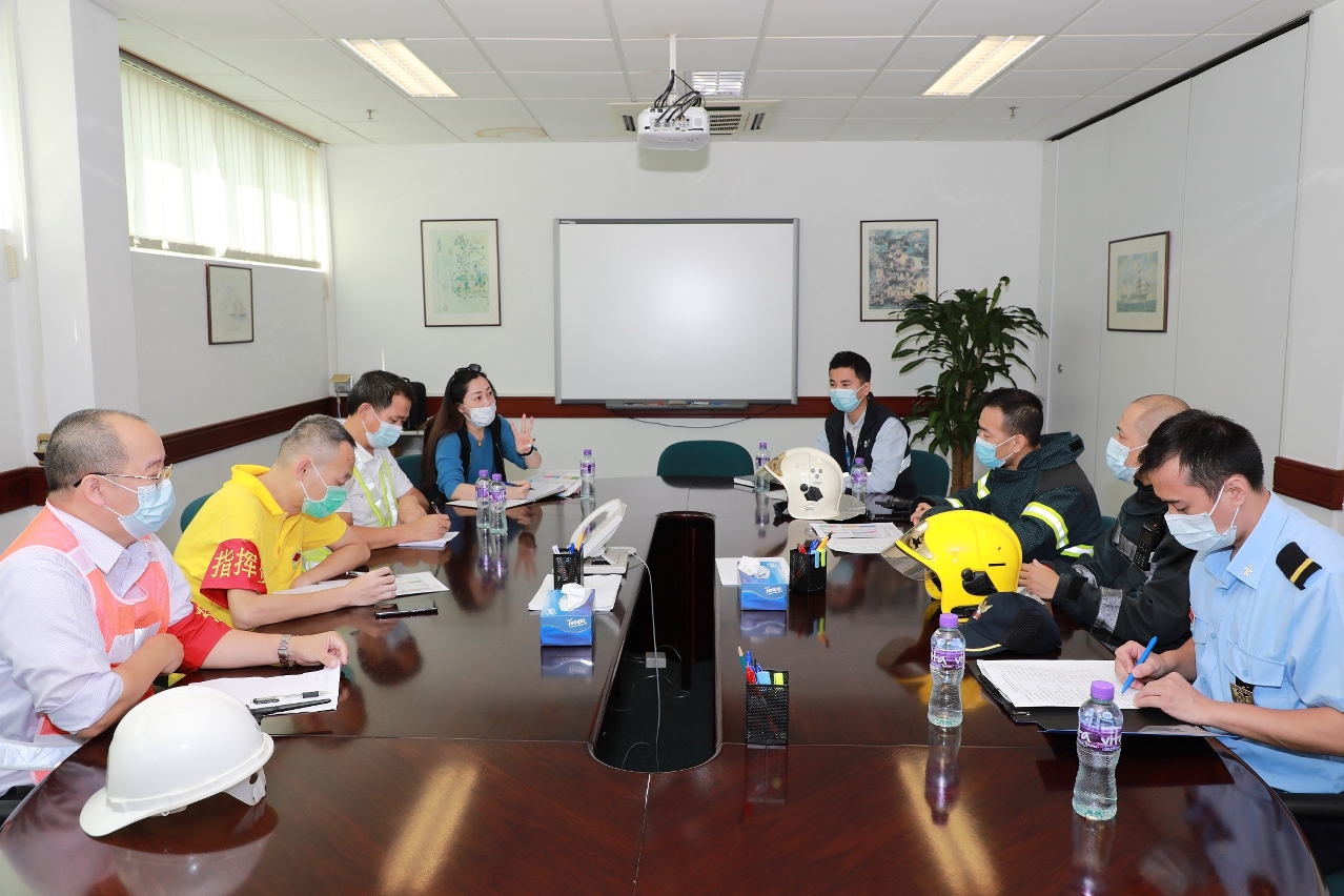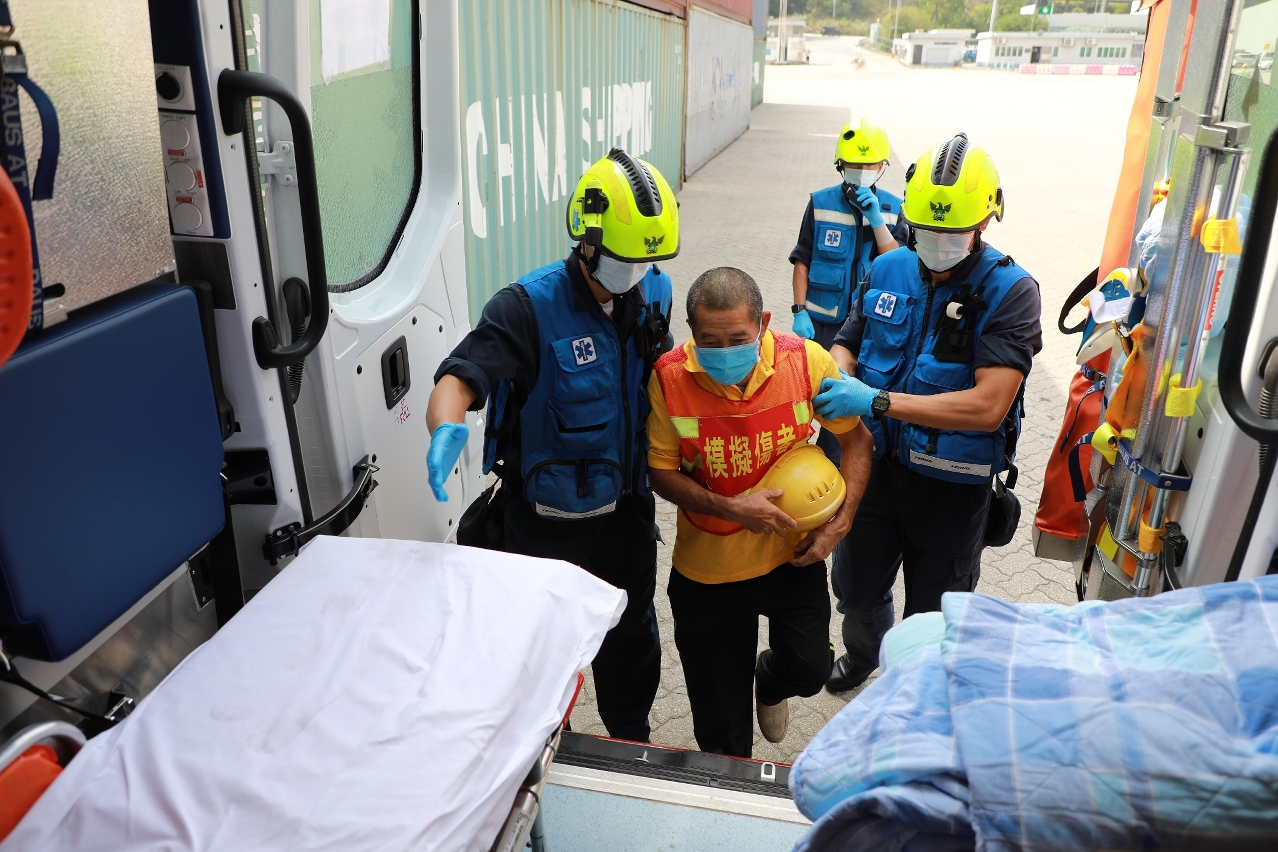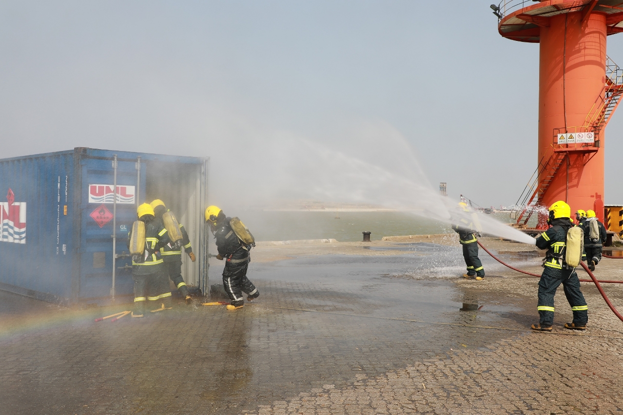 演习模拟危险品货柜在起卸过程中,装载第3类货物甲苯的集装箱冒烟。九澳货柜码头随即致电消防局报案,并立即启动安全措施,指令现场停止操作及按照内部应急计划疏散相关人员到逃生集合点,演习模拟有1名员工不慎吸入气体不适。消防局接报后立即派遣6辆紧急车辆及27名队员赶赴现场处理事故及进行疏散行动,并将1名伤者送往医院治理。