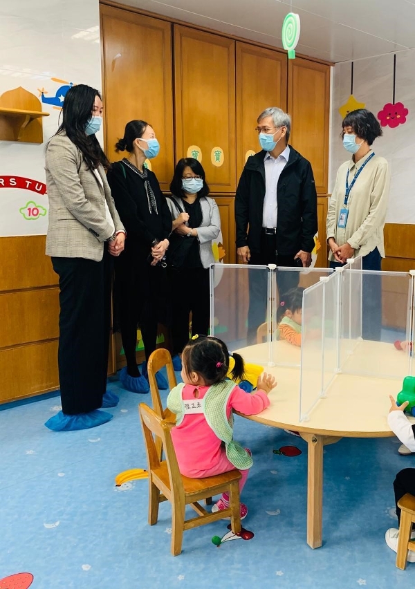 社会工作局社会互助厅蔡兆源厅长与主管人员早上先后探 访街总小海燕托儿所、工联望厦托儿所、妇联小蜜蜂托儿所, 瞭解各间托儿所逐步复托首日的服务情况,整体运作畅顺。在 执行防疫工作上,除了有一般性的预防和检疫措施外,托儿所 亦针对各活动室的空间、培育活动、用餐及午睡等方面作出相 应安排。基于三岁以下幼儿不适宜长时间佩带口罩,托儿所安 排幼儿保持适当的距离外,同时视乎环境的实际需要,装设防 水阻隔板,加强对幼儿的安全保护。