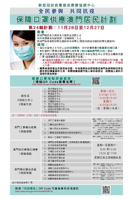 新型冠状病毒感染应变协调中心今(23)日公布,第24轮保障口罩供应澳门居民计划于本周六(28日)开始,售卖期间为30日,即11月28日至12月27日,期间每人可一次性购买30个口罩,售价合共24澳门元。对象包括本澳永久及非永久居民、持外地雇员身份认别证(俗称蓝咭)人士,以及持澳门各高等院校学生证的非本地学生,学生在购买口罩时须出示所就读高等院校的学生证,经系统成功识别学生证资料后方能购买。
