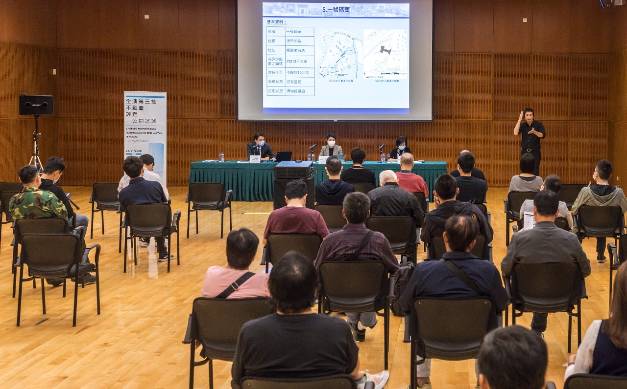 首场公众咨询会由文化局副局长梁惠敏、文化遗产厅厅长蔡健龙、首席顾问高级技术员崔贞贞出席,向巿民详细讲解《全澳第三批不动产评定》咨询文本的内容,并听取公众意见,集思广益。第二场公众咨询会续于12月12日(星期六)下午3时在澳门文化中心会议室举行,欢迎市民积极参与、发表意见。