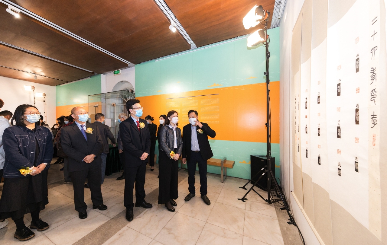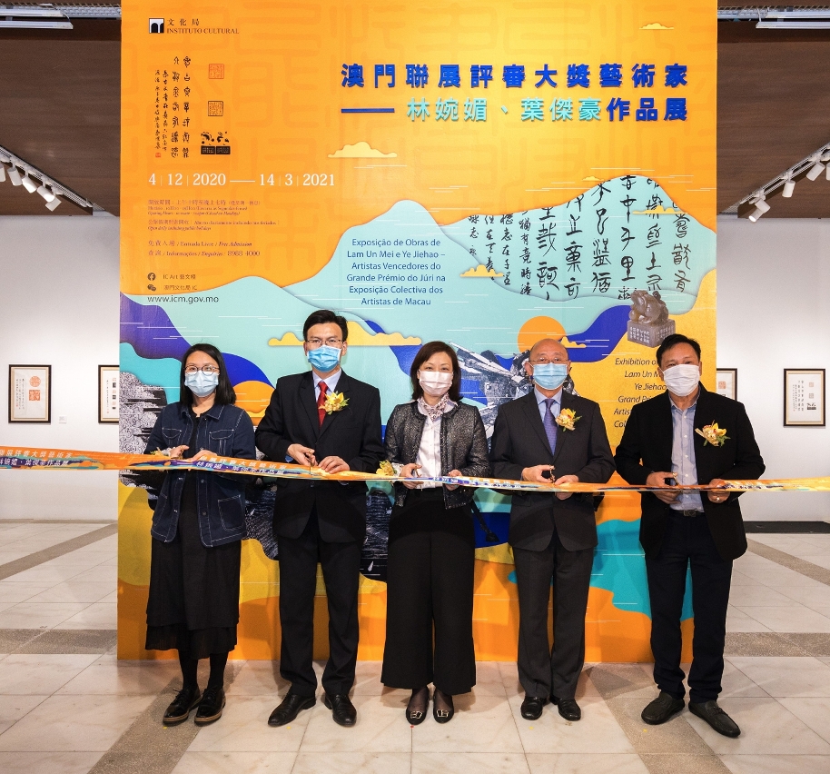 由文化局主办的“澳门联展评审大奖艺术家──林婉媚、叶杰豪作品展”今天(12月3日)在龙环葡韵汇艺廊举行开幕式,文化局局长穆欣欣、中央人民政府驻澳门特别行政区联络办公室宣传文化部助理王宇伟、澳门日报社长陆波、参展艺术家林婉媚及叶杰豪主礼。