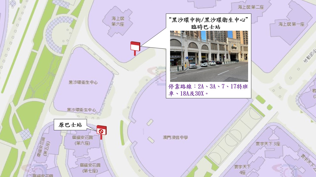 因应市政署重铺路面,12月11日(周五)至18日(周五)黑沙环中街实施有限度通车,“黑沙环中街/黑沙环卫生中心”站临时往海上居方向迁移约70米,详情请见下表。市政署及交通事务局呼吁驾驶者留意有关安排。