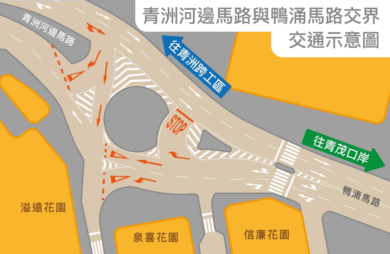 按照整治方案,调整交界路口的行车安排后,由鸭涌马路方向之调头车辆,无需再绕过花圃,可经由回转车道调头;而由青洲跨工区进入青洲河边马路之车辆,亦无需再绕过花圃,可按交通标志及标线指示直接右转驶往溢远花园方向或进行调头。