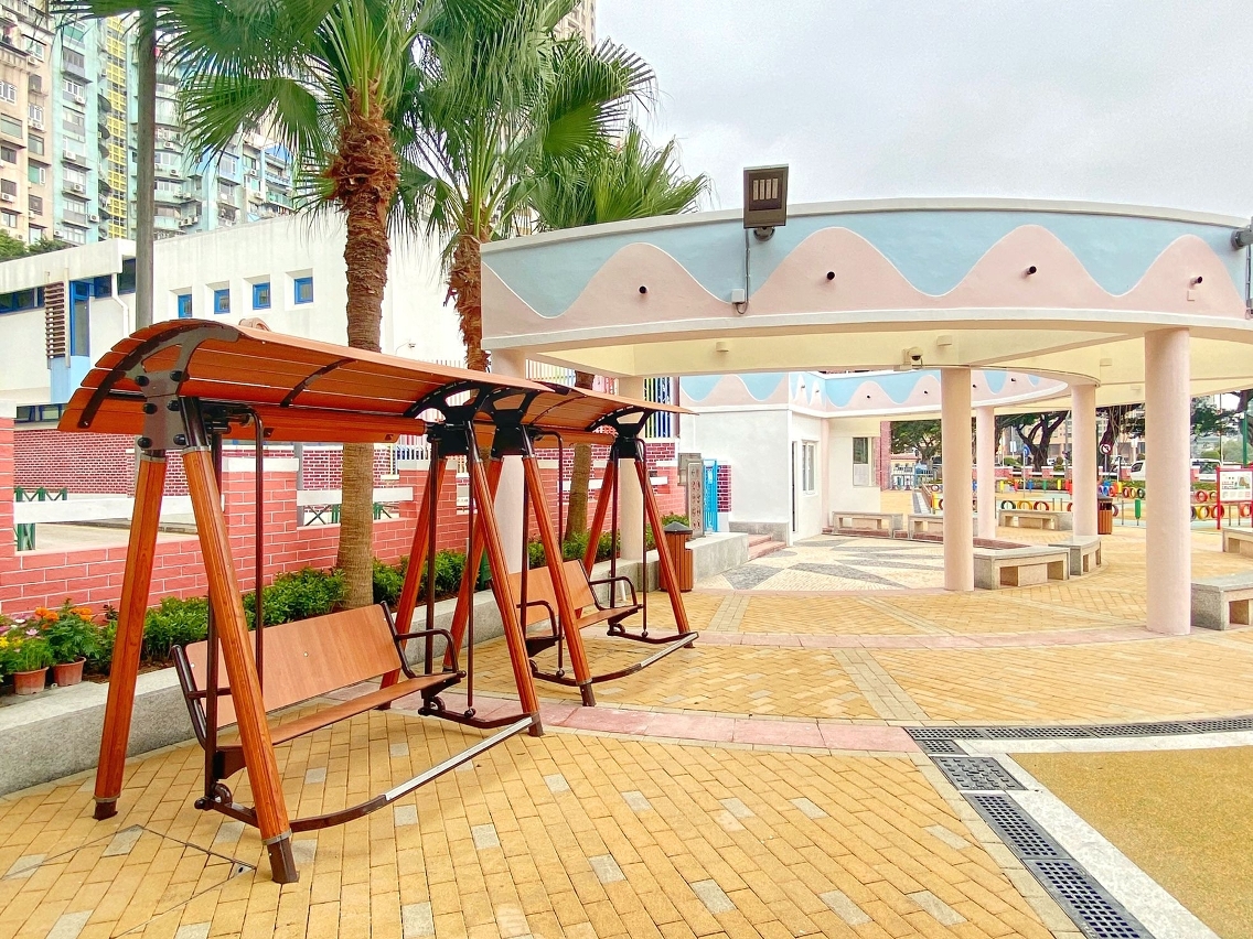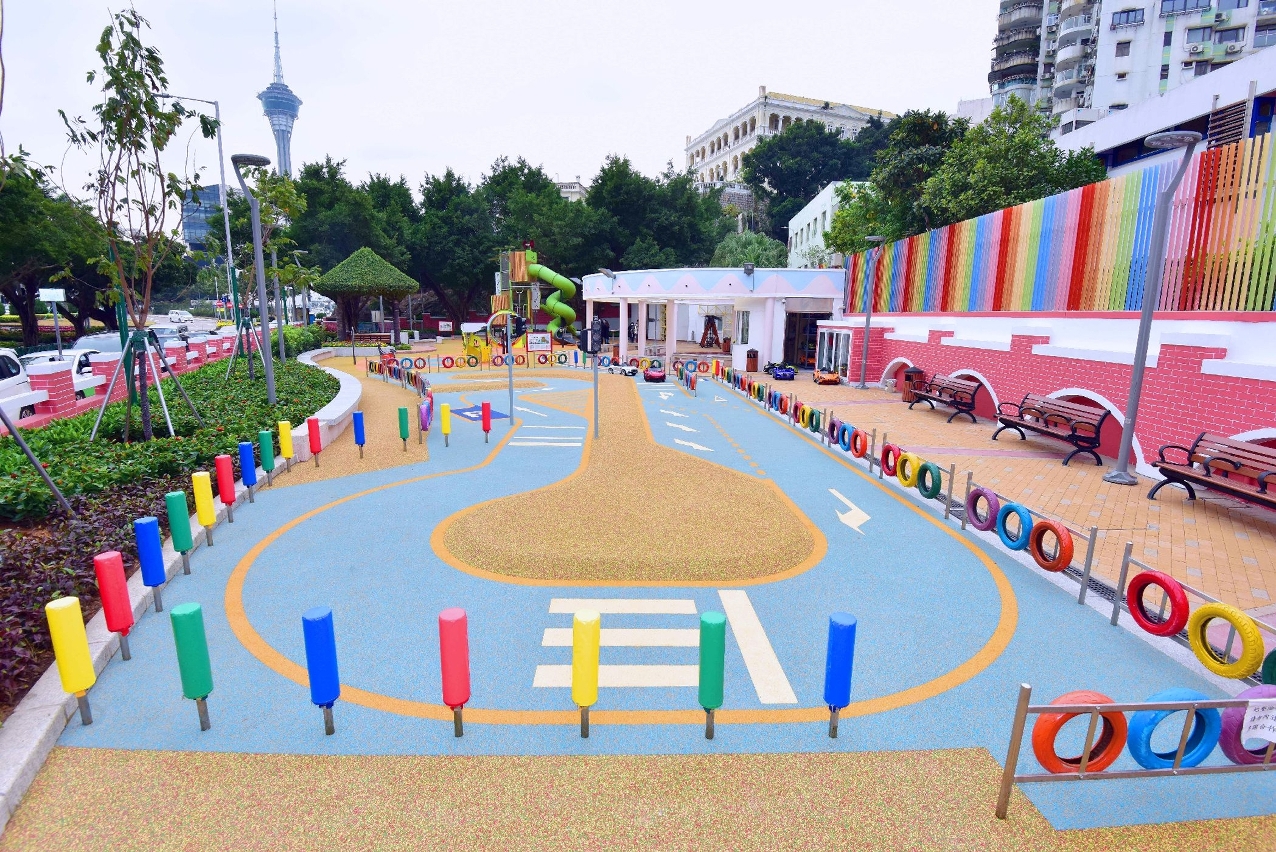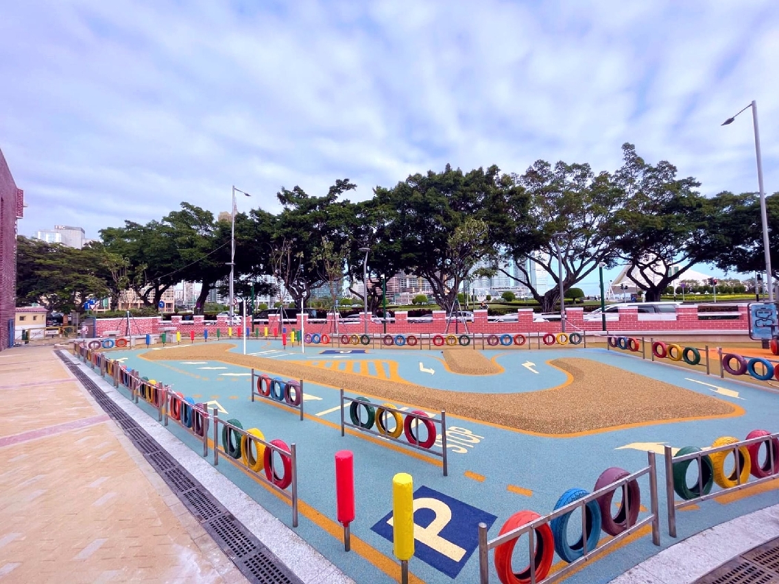 在重新布局的儿童游戏区内,新增综合型儿童组合玩具以及训练体能的游乐设施,区分予不同年龄层儿童使用;考虑到较大年龄段儿童的身心发展,以及对户外游乐设施的需要,公园内增设一组适合八至十二岁儿童使用,富含攀爬元素,可锻炼身体协调性及平衡感,兼具适度挑战性的大型游具。另外,优化后的儿童电动车场区交通安全城的设施,增设了红绿灯及行人过路灯等,让儿童从游戏中认识交通设施及遵守交通秩序,而重铺的安全地垫显示车道图案及车道分隔岛,可增加电动车游戏的趣味性。园区内亦考虑到不同年龄使用者需要,增加座椅以供居民休憩使用,同时亦鼓励家长在带同子女使用公共设施时,适当地从旁给予安全指导,一同享受亲子玩乐时光。