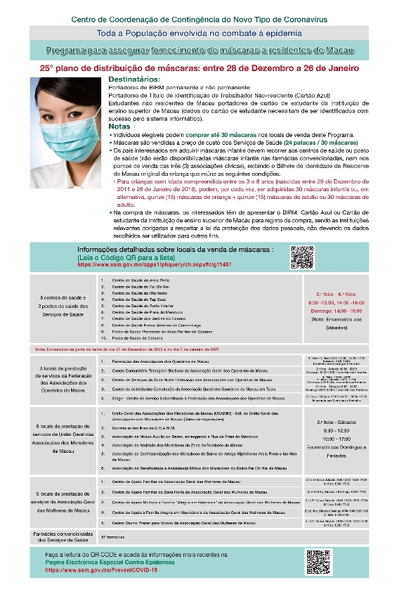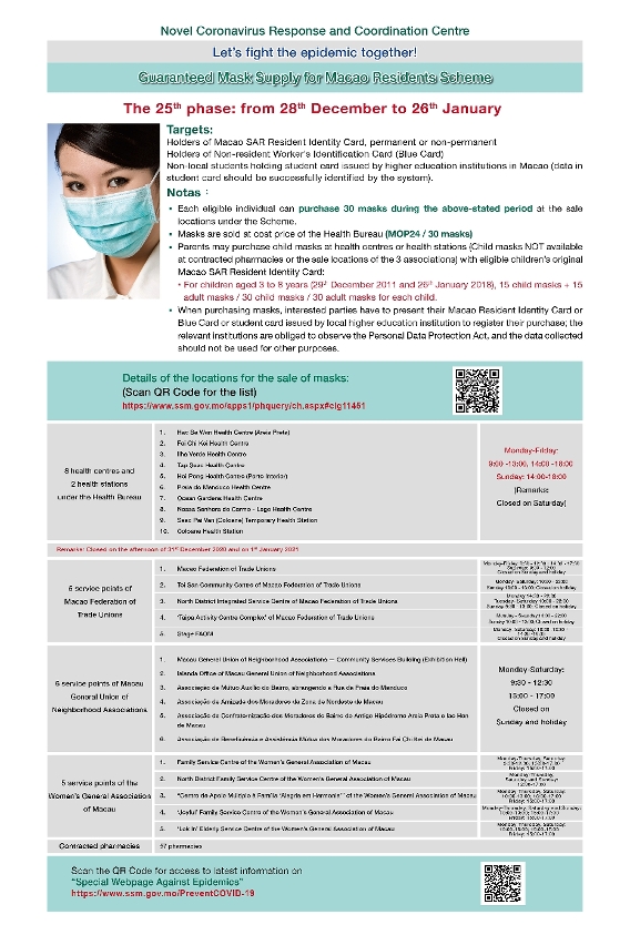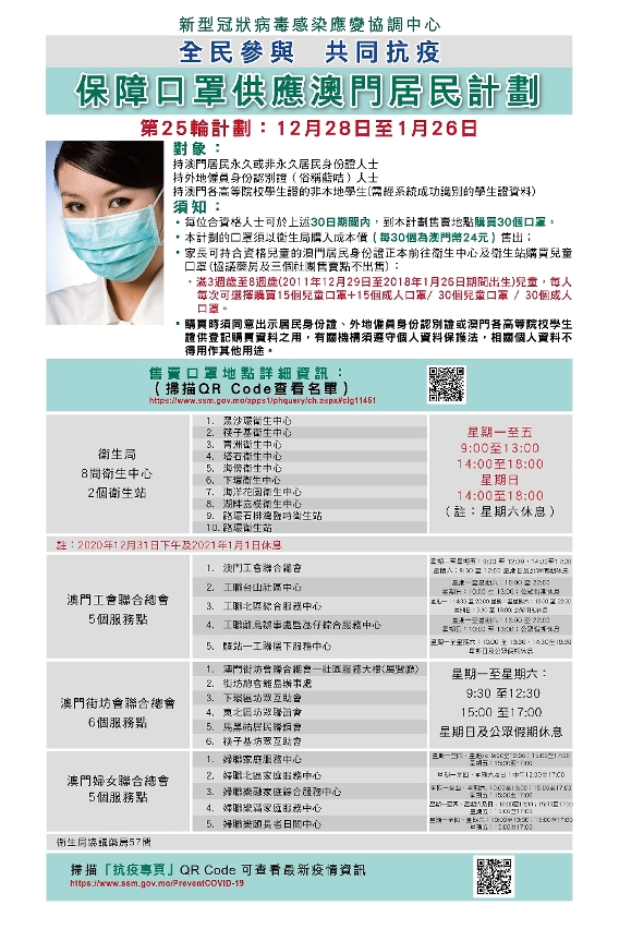 新型冠状病毒感染应变协调中心今(23)日公布,第25轮保障口罩供应澳门居民计划于下周一(28日)开始,售卖期间为30日,即2020年12月28日至2021年1月26日,期间每人可一次性购买30个口罩,售价合共24澳门元。对象包括本澳永久及非永久居民、持外地雇员身份认别证(俗称蓝咭)人士,以及持澳门各高等院校学生证的非本地学生,学生在购买口罩时须出示所就读高等院校的学生证,经系统成功识别学生证资料后方能购买。